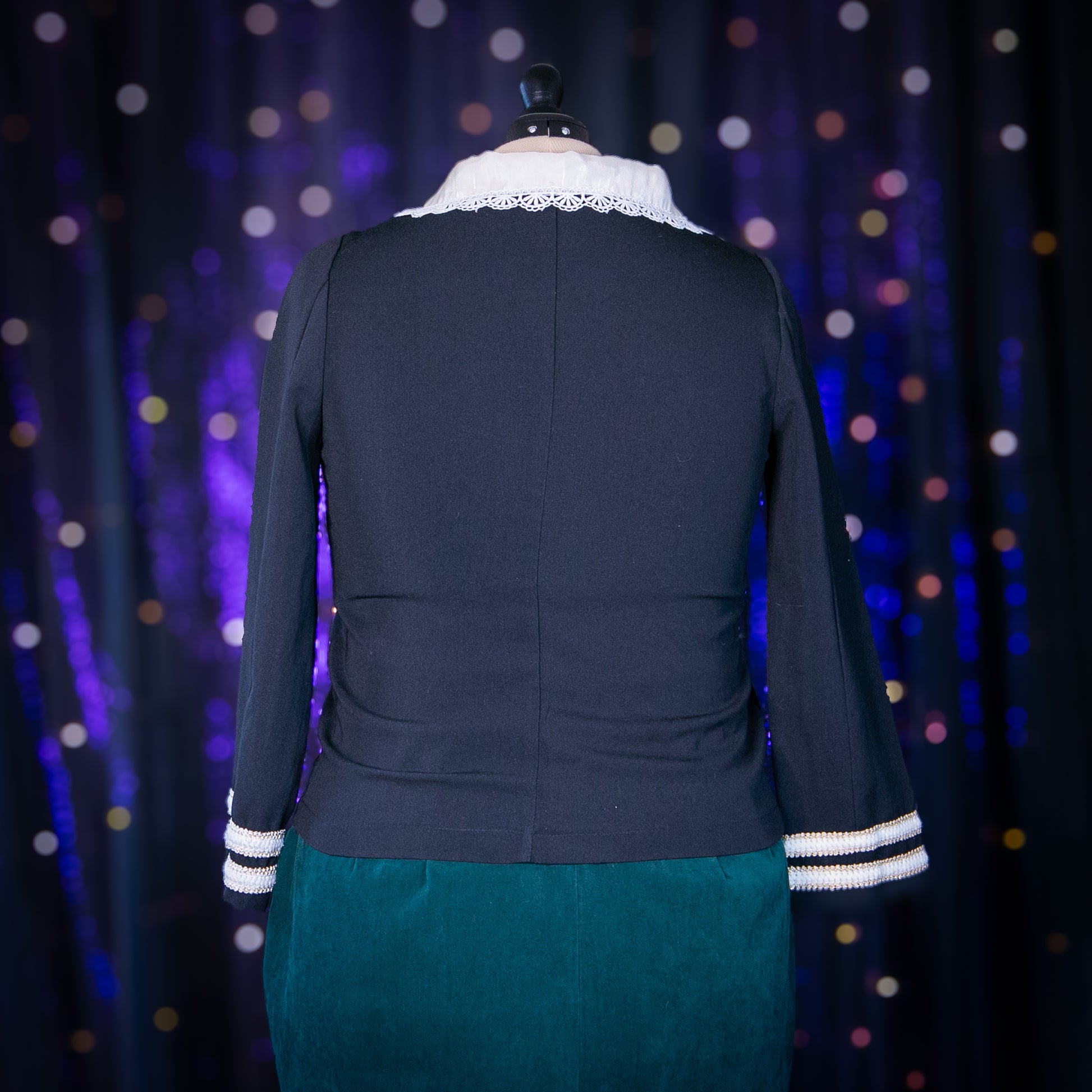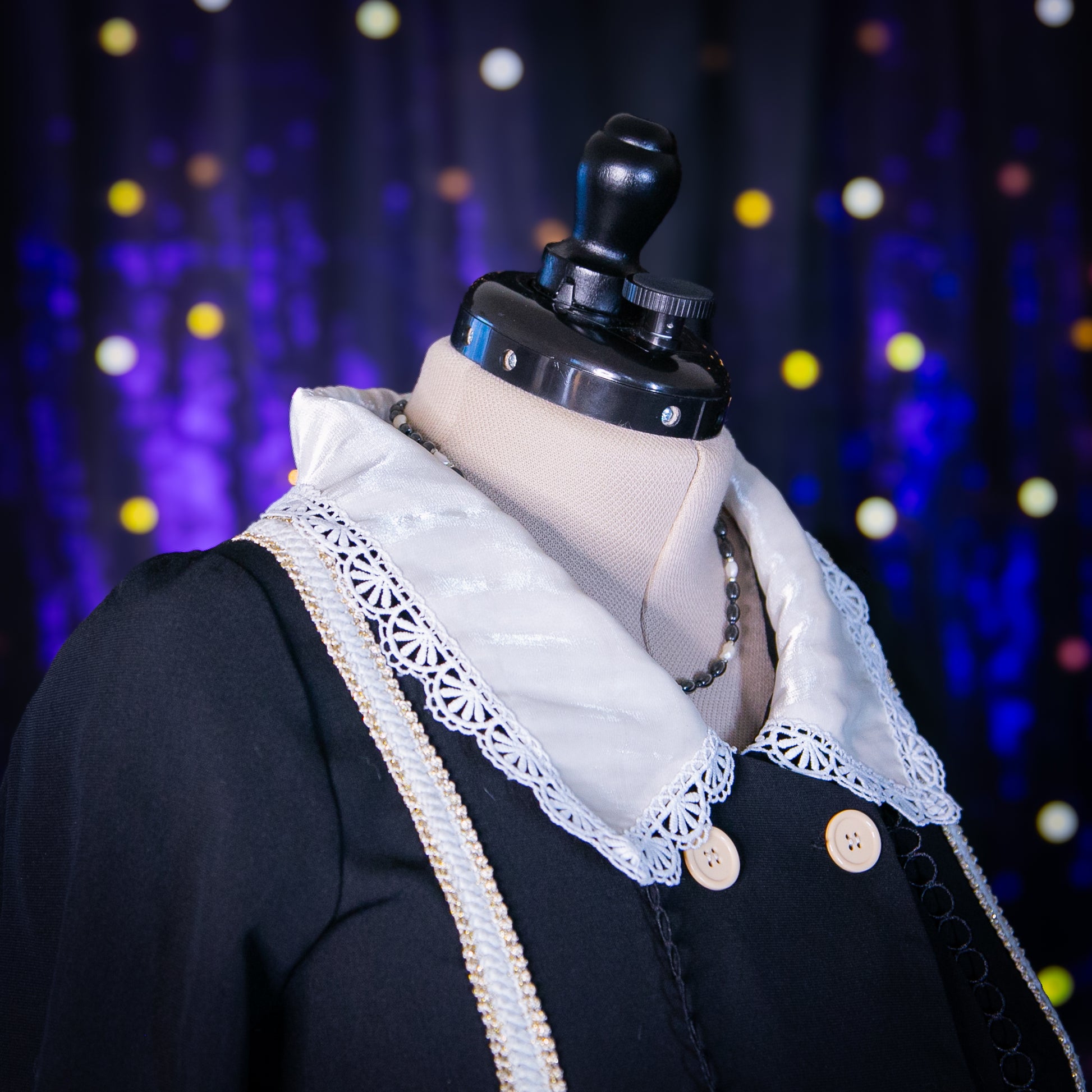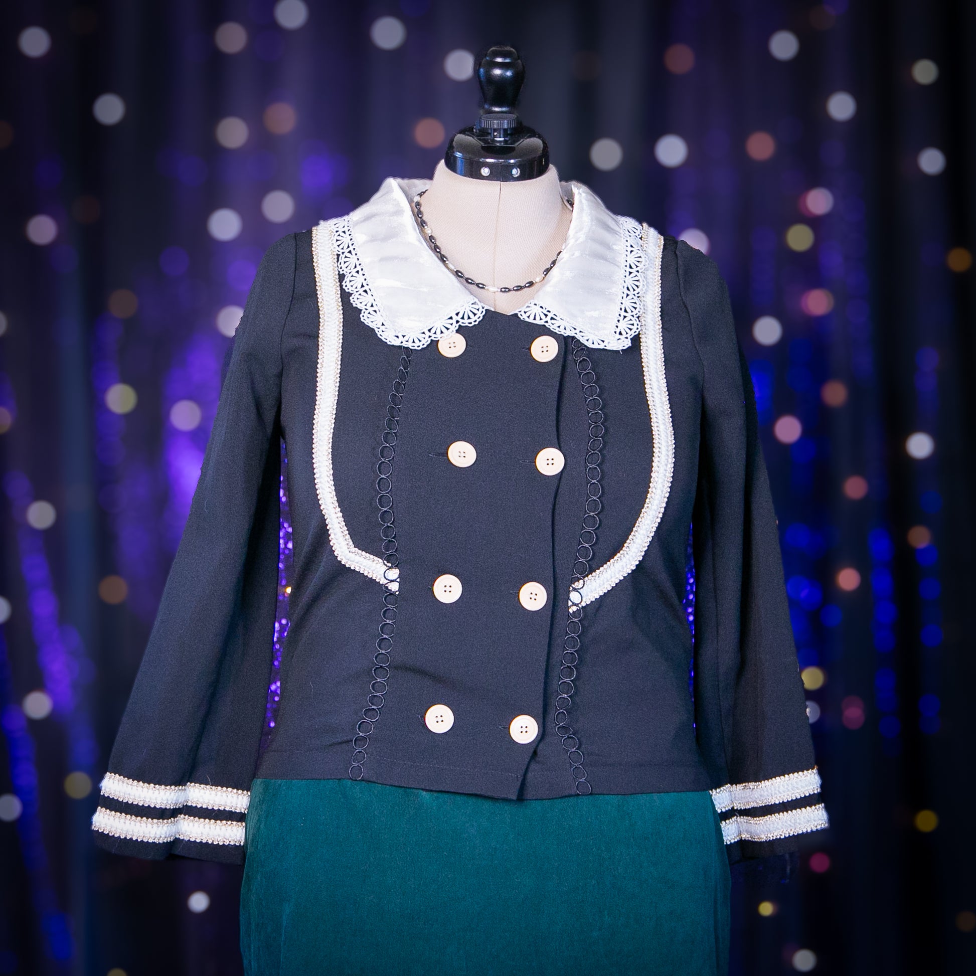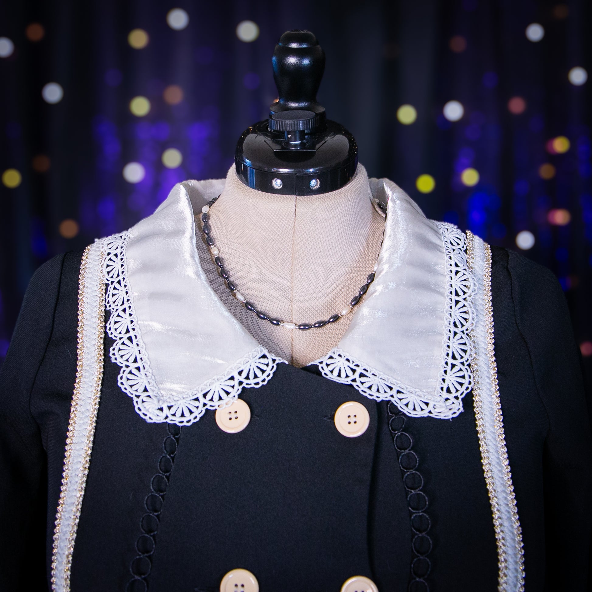 - Features: White Chiffon Collar; Scallop Lace Trim; Large Cream Buttons