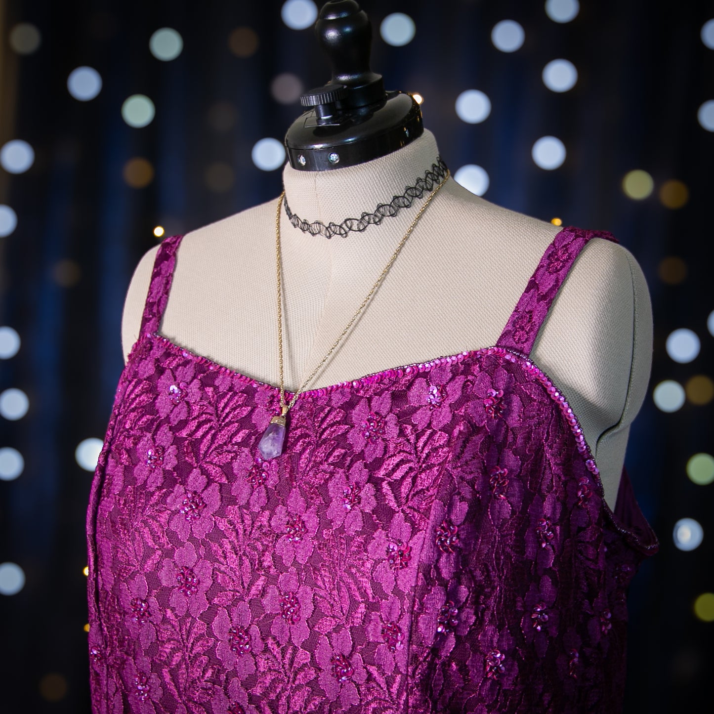 Vintage berry purple sleeveless midi/maxi length dress with matching seed beads and sequins lining the neckline and hem. Skirt of dress feels like chiffon and top layer is lace. Dress zips up the back and is lined. Straps are adjustable.