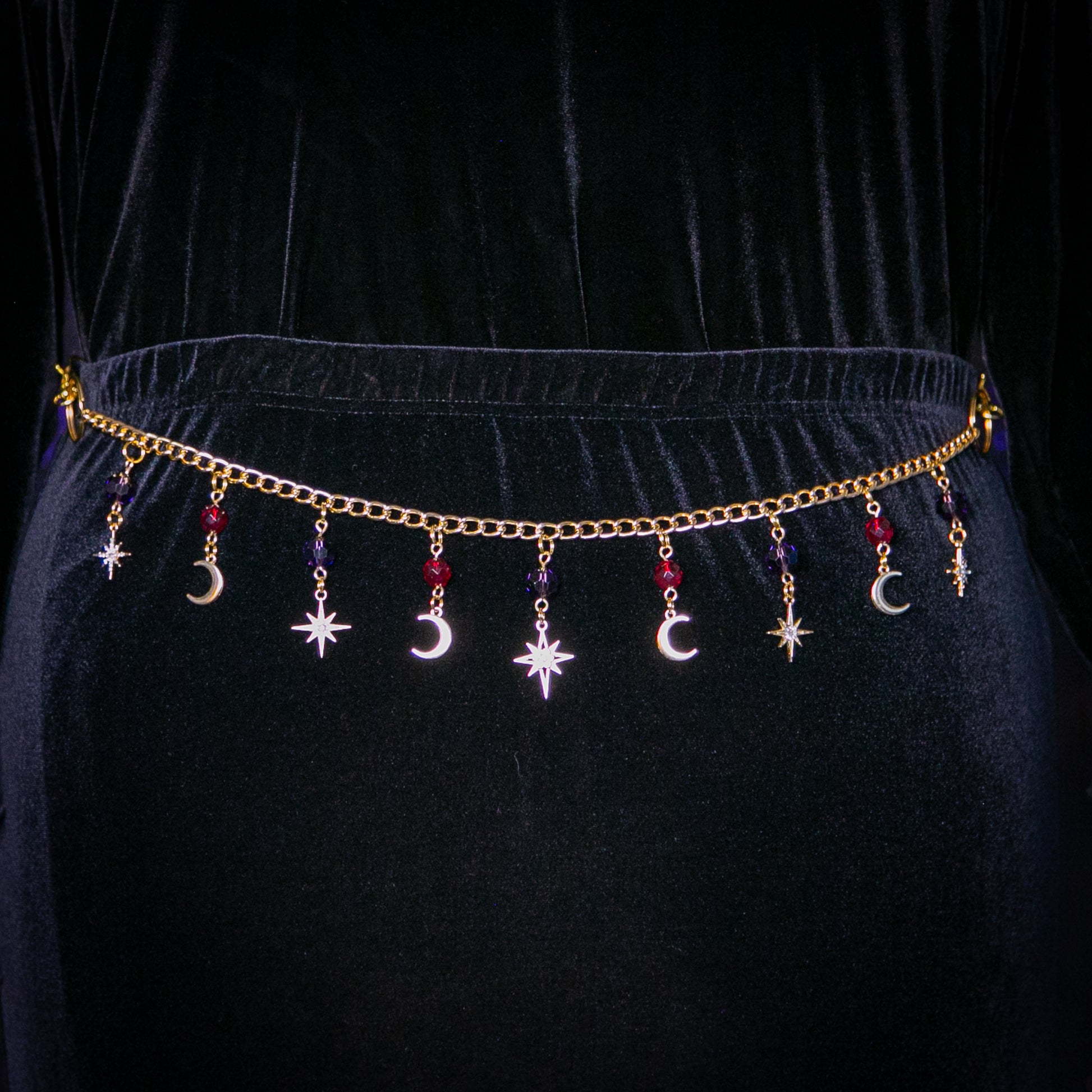 Goldtone Charmed Chain with purple and dark red faceted crystal beads, and a variety of rhinestone starburst and crescent moon charms.