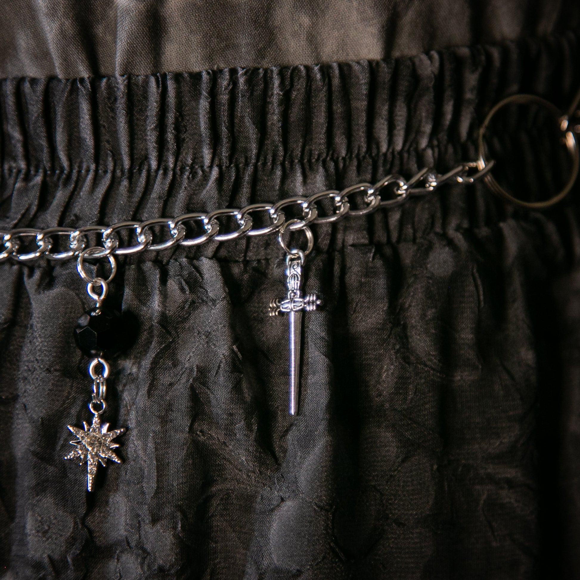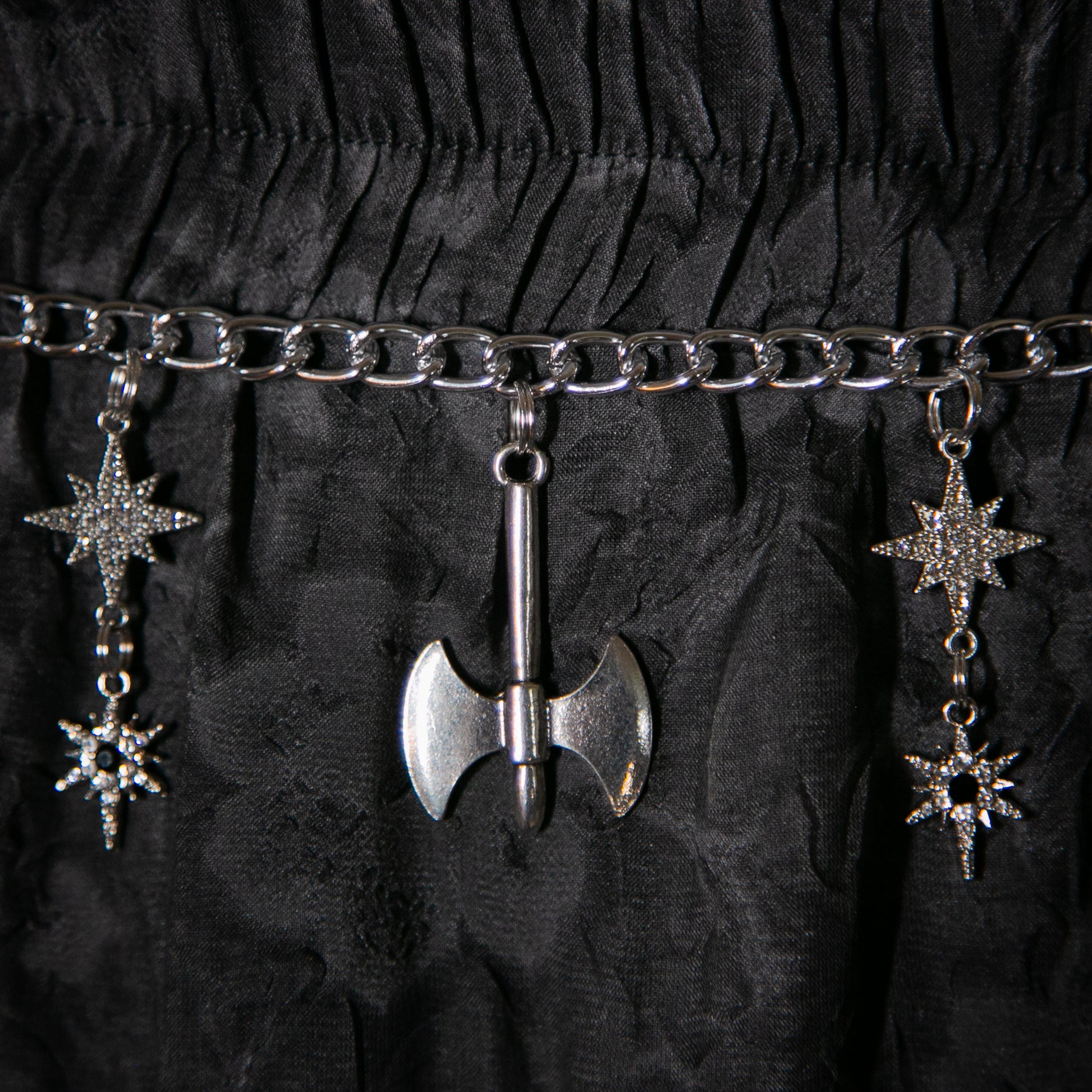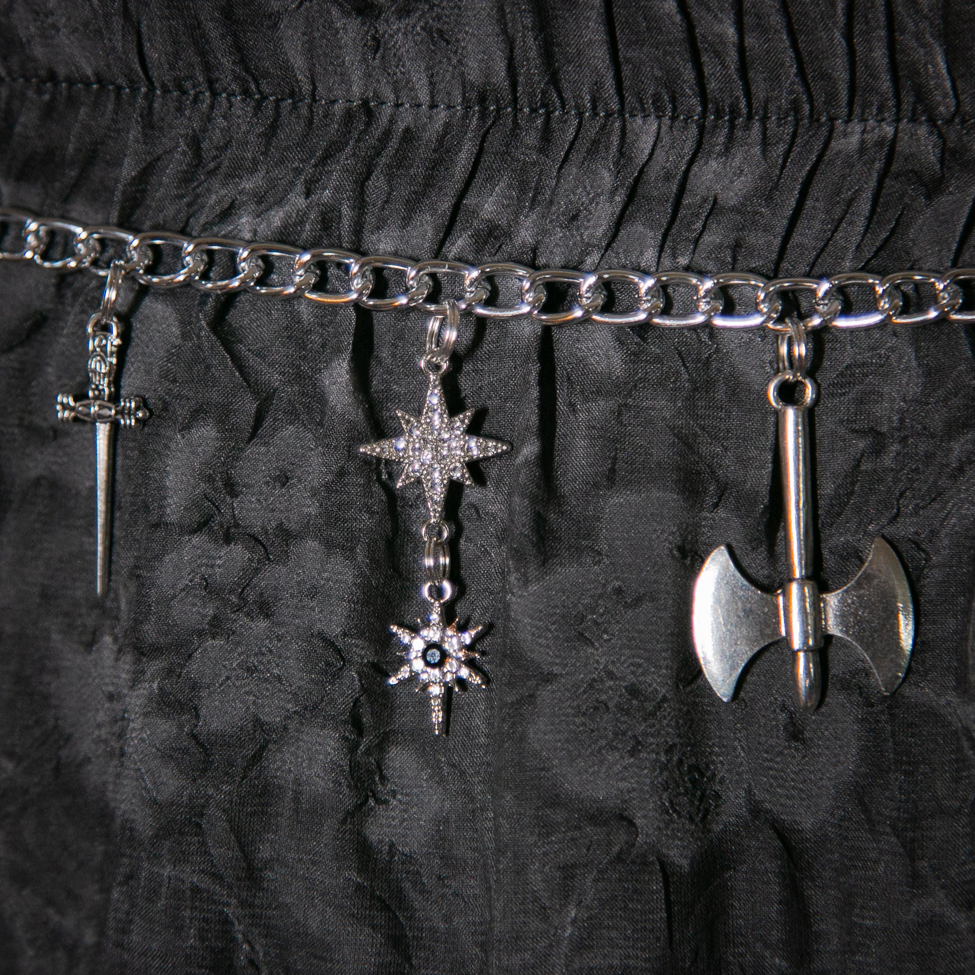 Silvertone Charmed Chain with black faceted crystal beads and a variety of rhinestone starbursts, swords, and a battle axe charm.