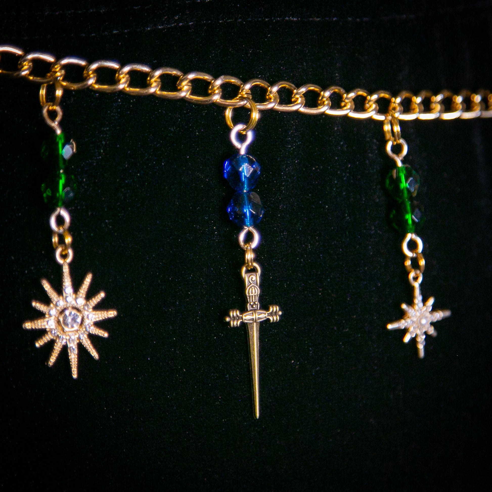 Gold tone Charmed Chain with green and blue faceted crystal beads, and a variety of rhinestone starburst and antiqued sword charms.