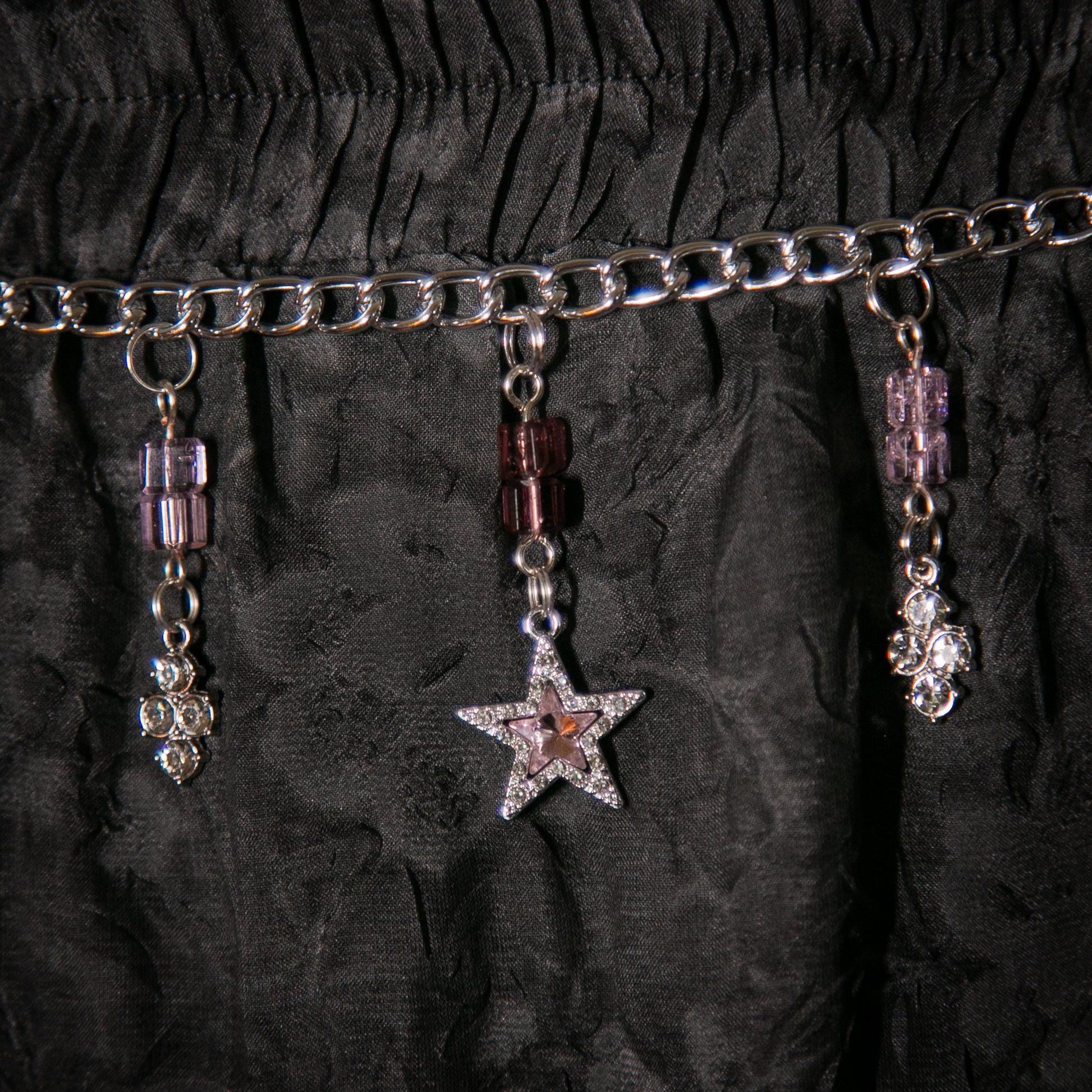 Each Charmed Chain and Belt is made by Kim of Bad Moon with almost entirely secondhand materials. Each Charmed Belt is one of a kind, adorned with an assortment of mixed metals, charms, glass and lucite beads, crystals, chains, and more.