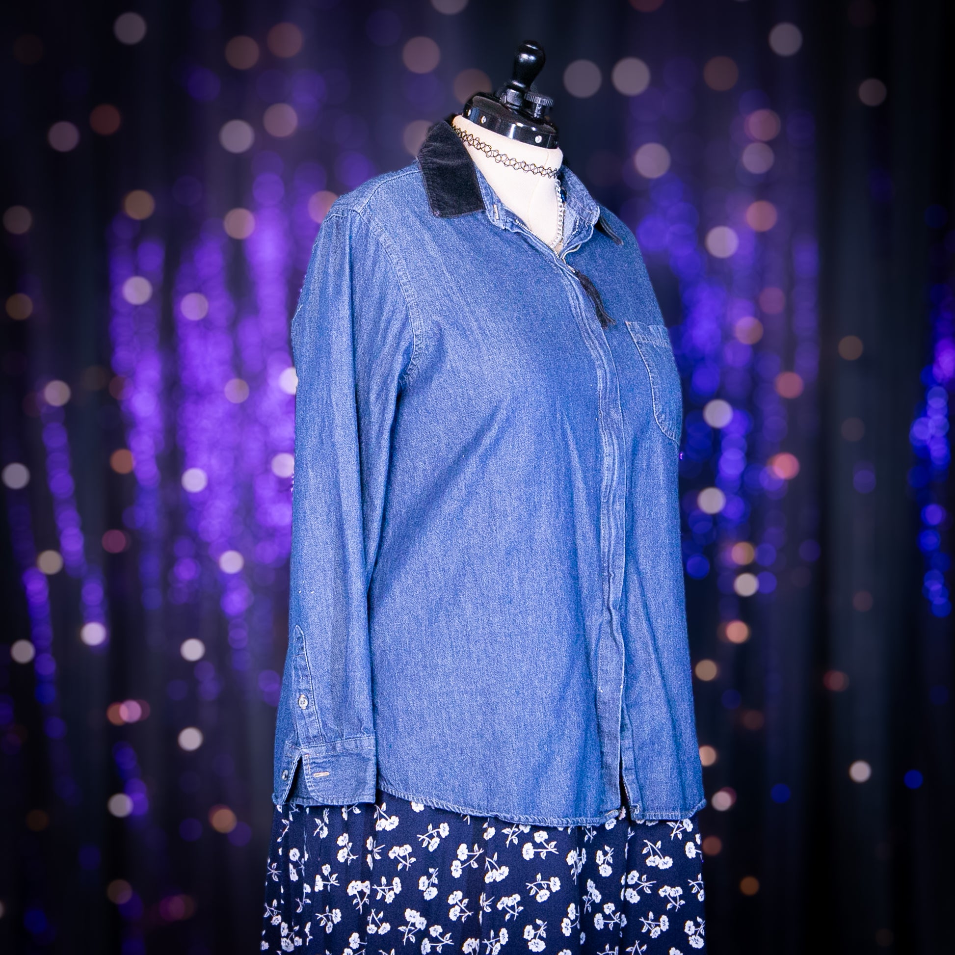 - Features: Black Velvet Collar; Matching Velvet Zipper Pull; Left Breast Pocket; Very Lightweight Denim