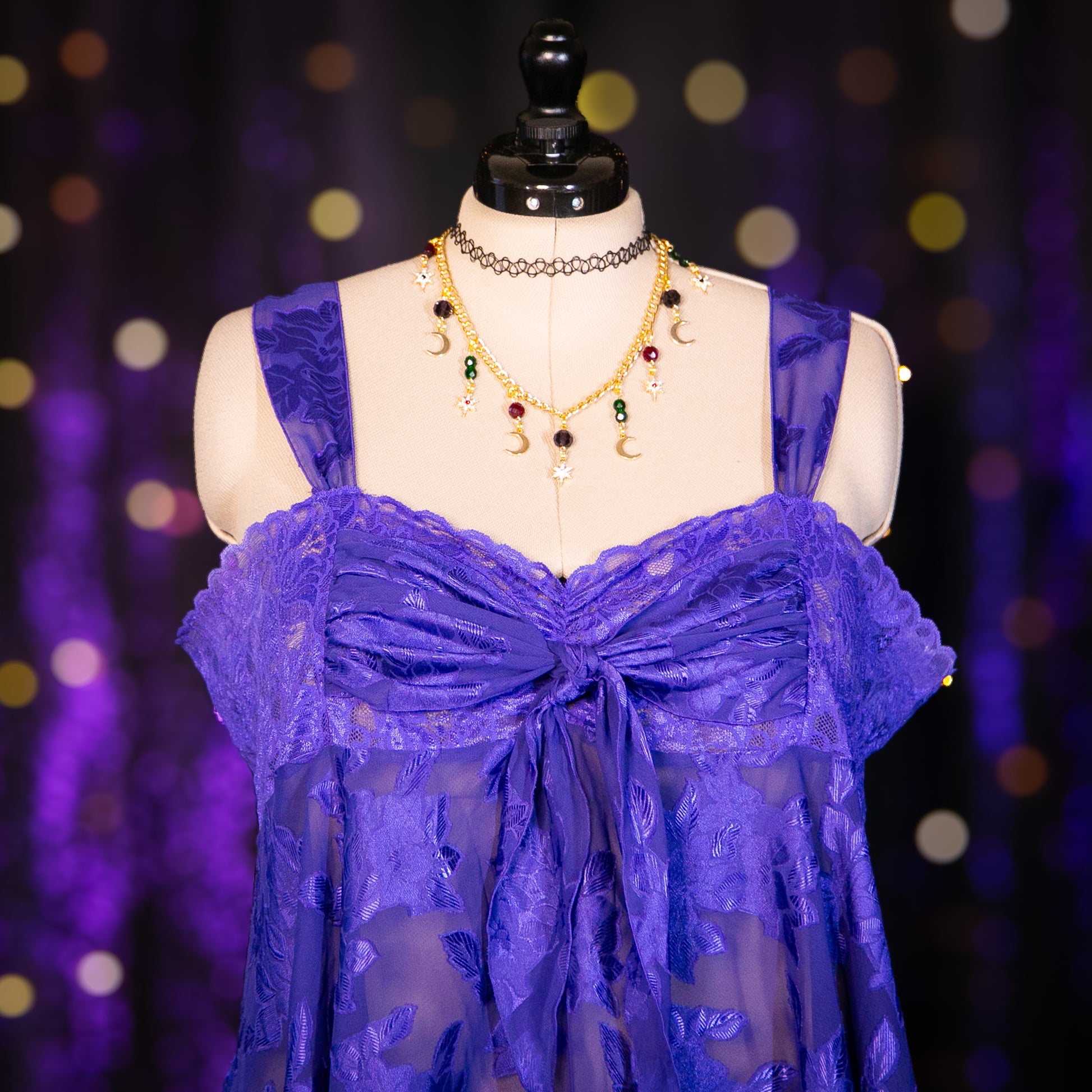 - Features: Lace Top with Tied Bust Sash; Adjustable Straps; Ruched Bust; Scalloped Lace