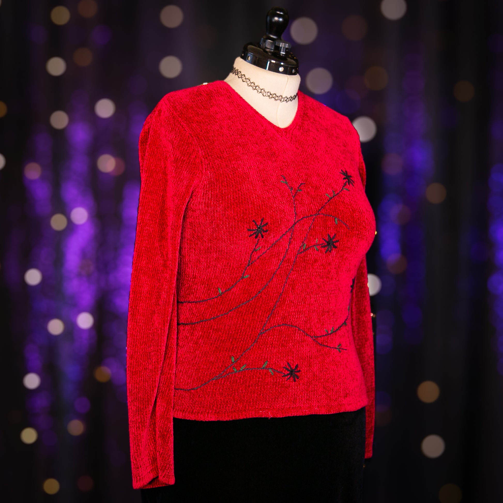- Pattern: Red with Black and Dark Green Embroidered Floral Vine Details