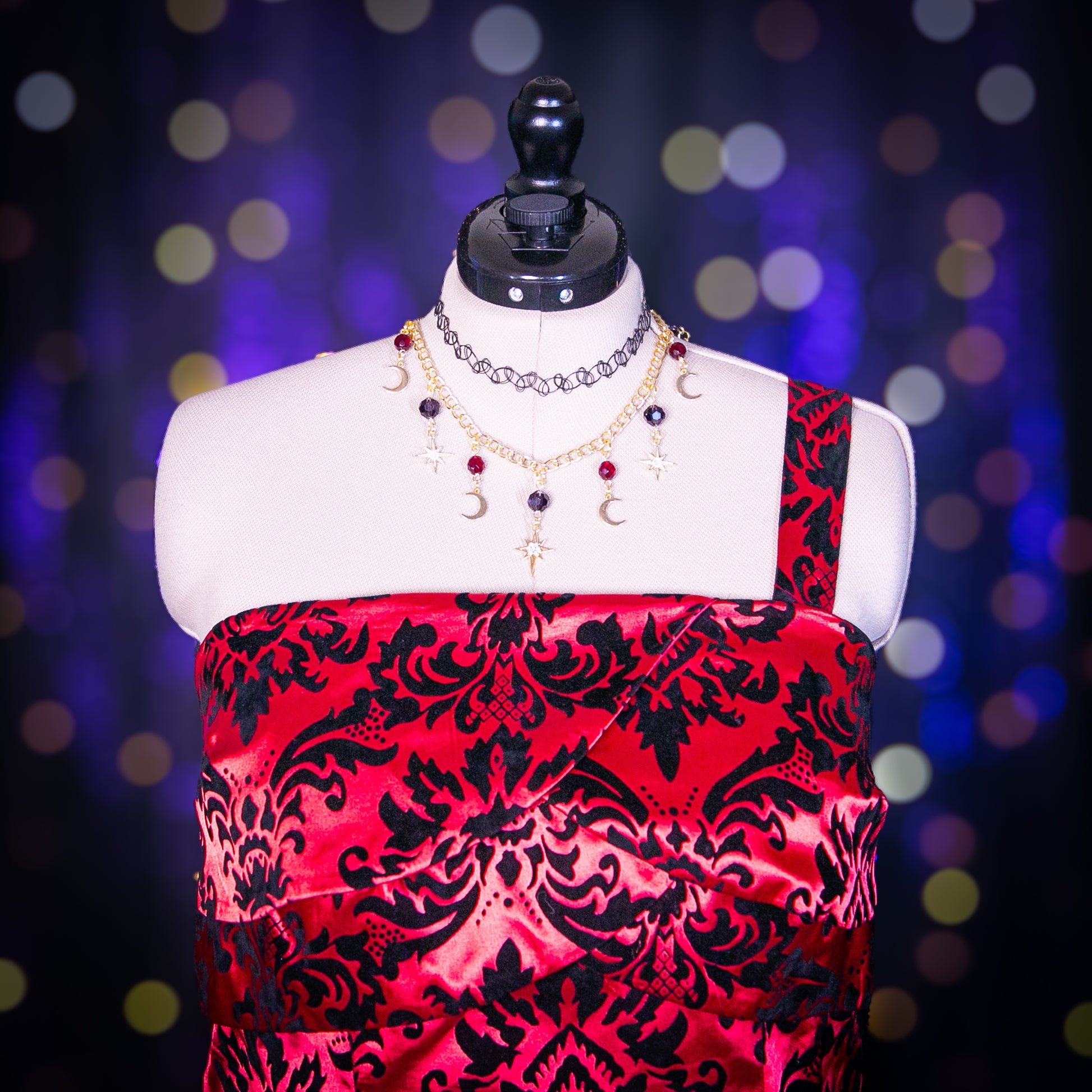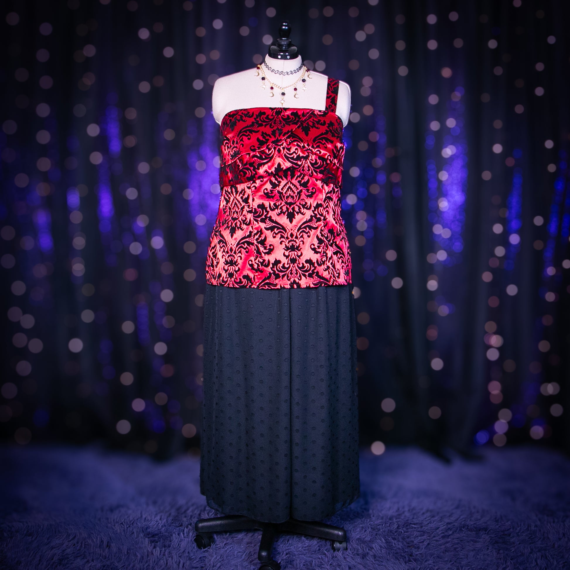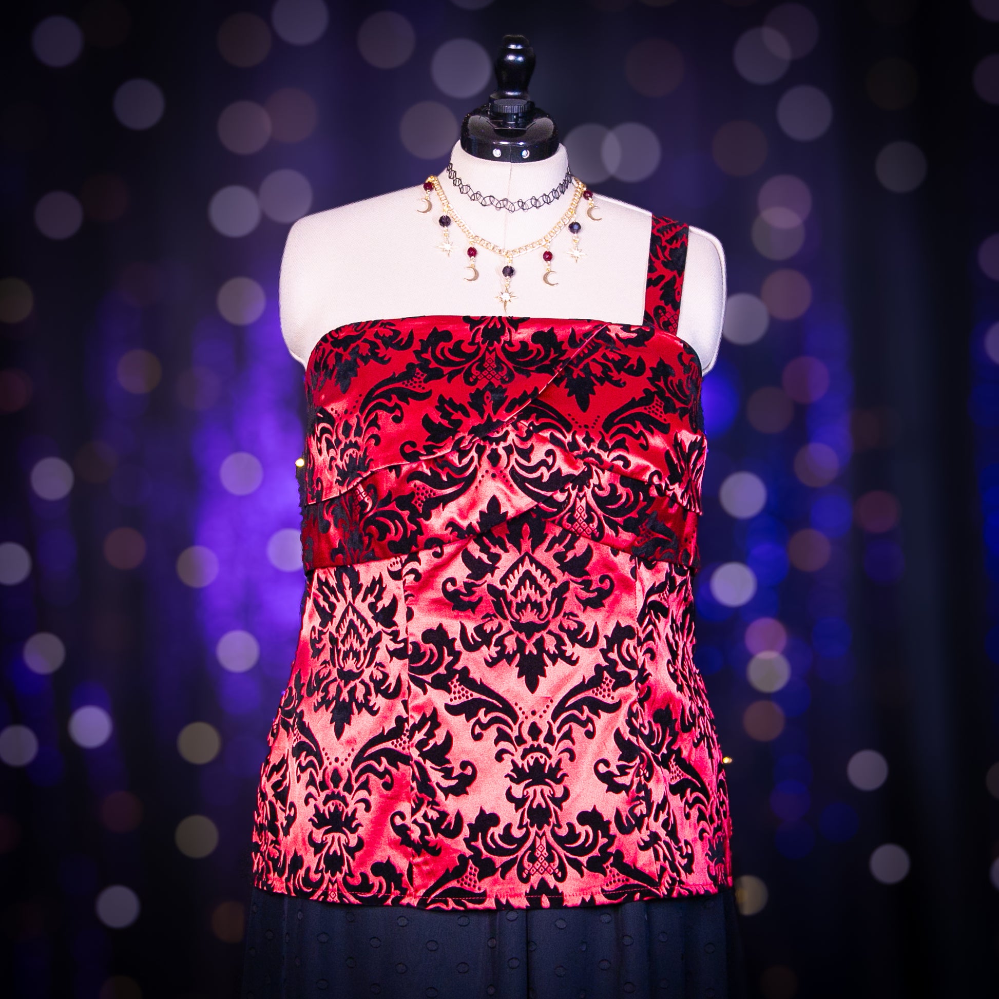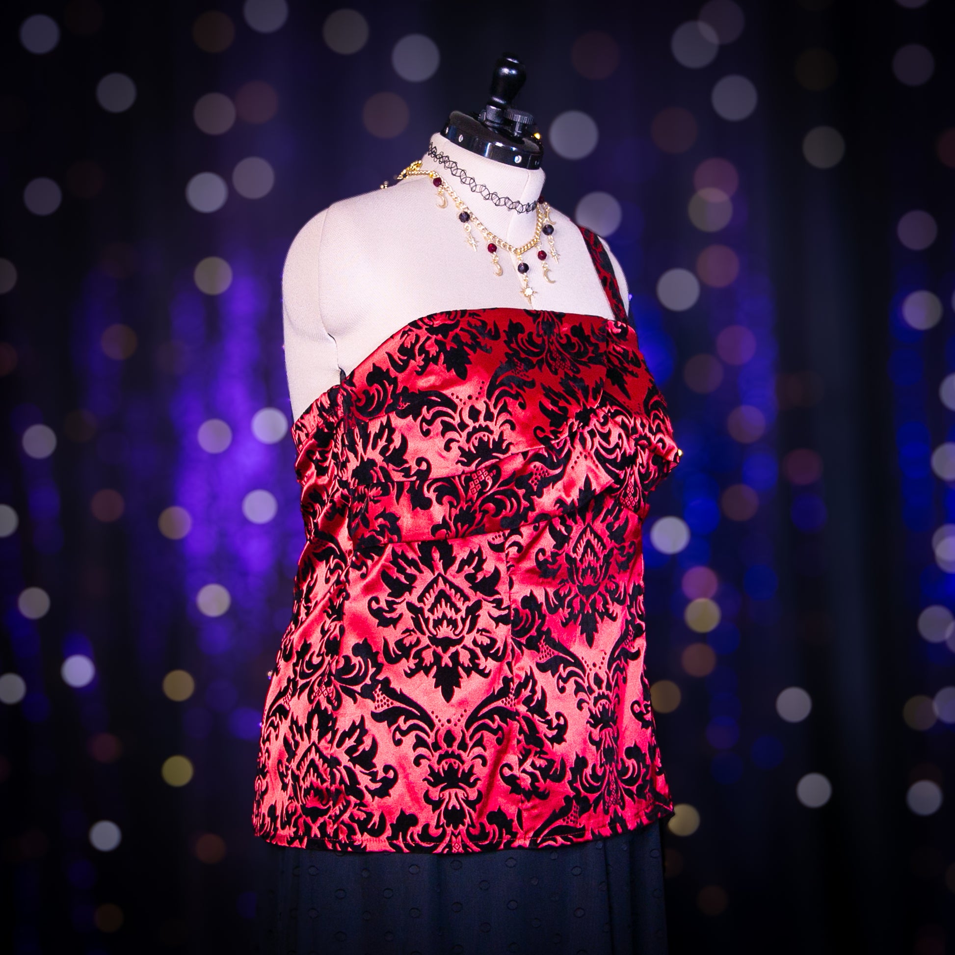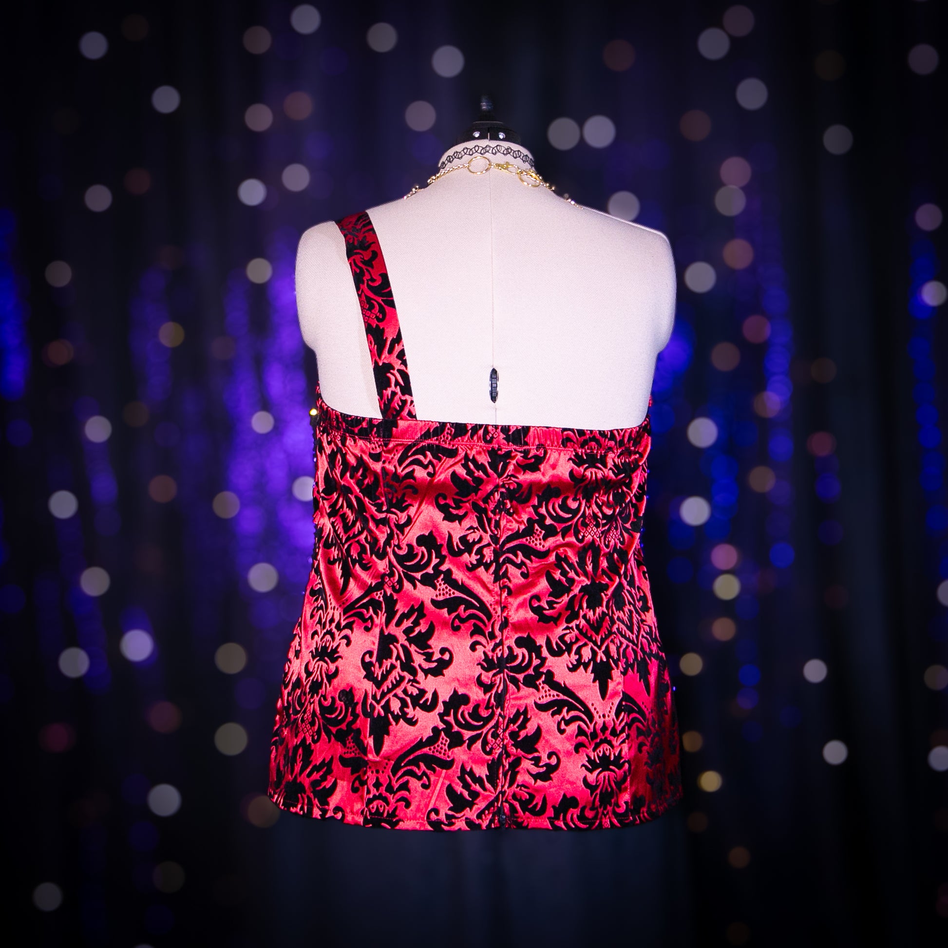 - Features: Flocked Velvet Print; Back Elastic Band; Petal Layers at Bust