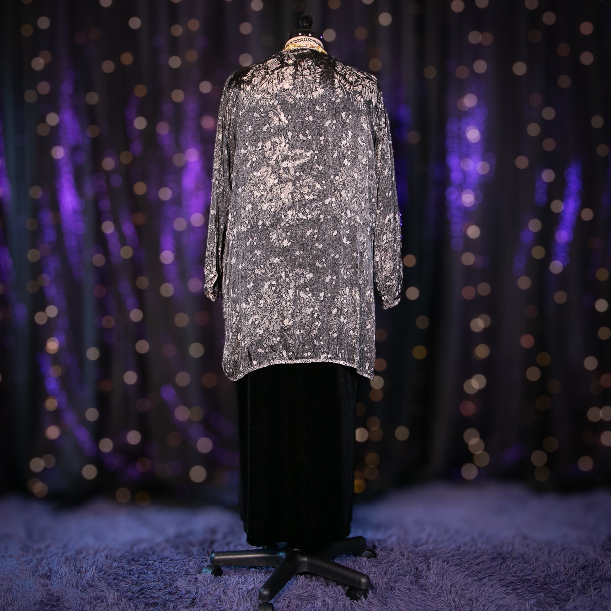 - Pattern: Black with Tan Wavy Line Print with Burnout Floral Print
