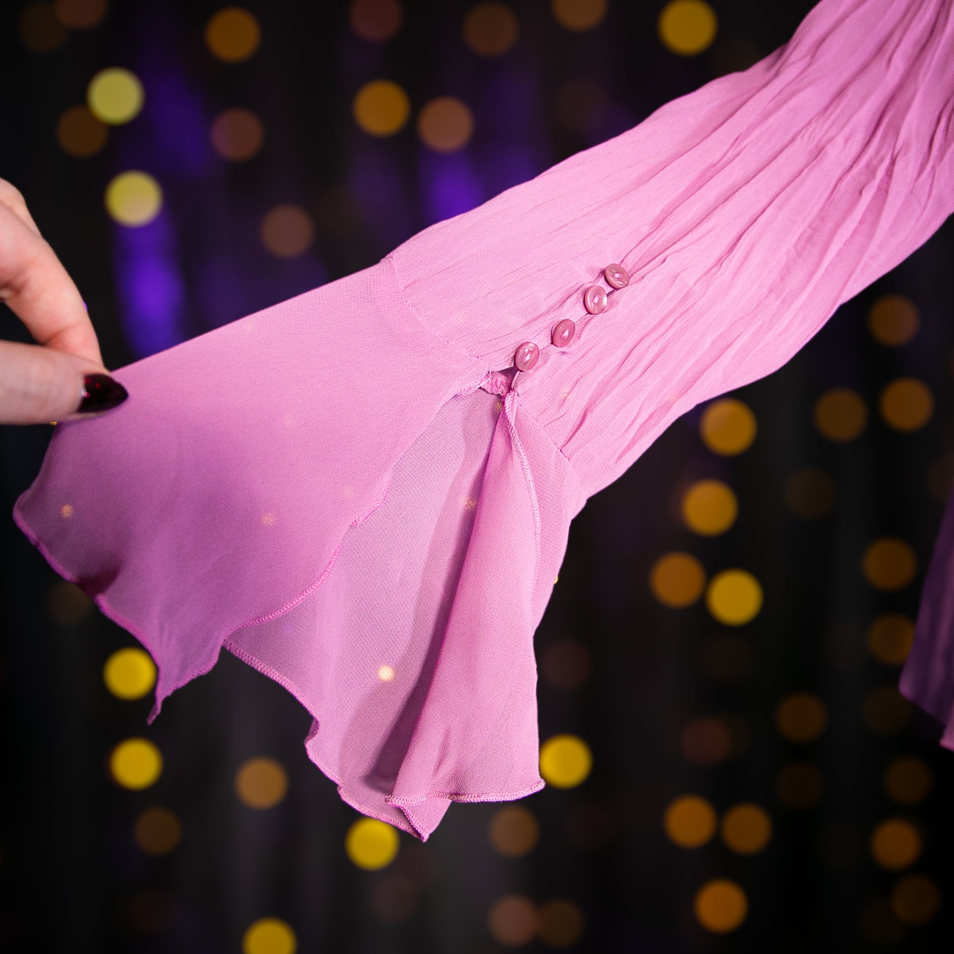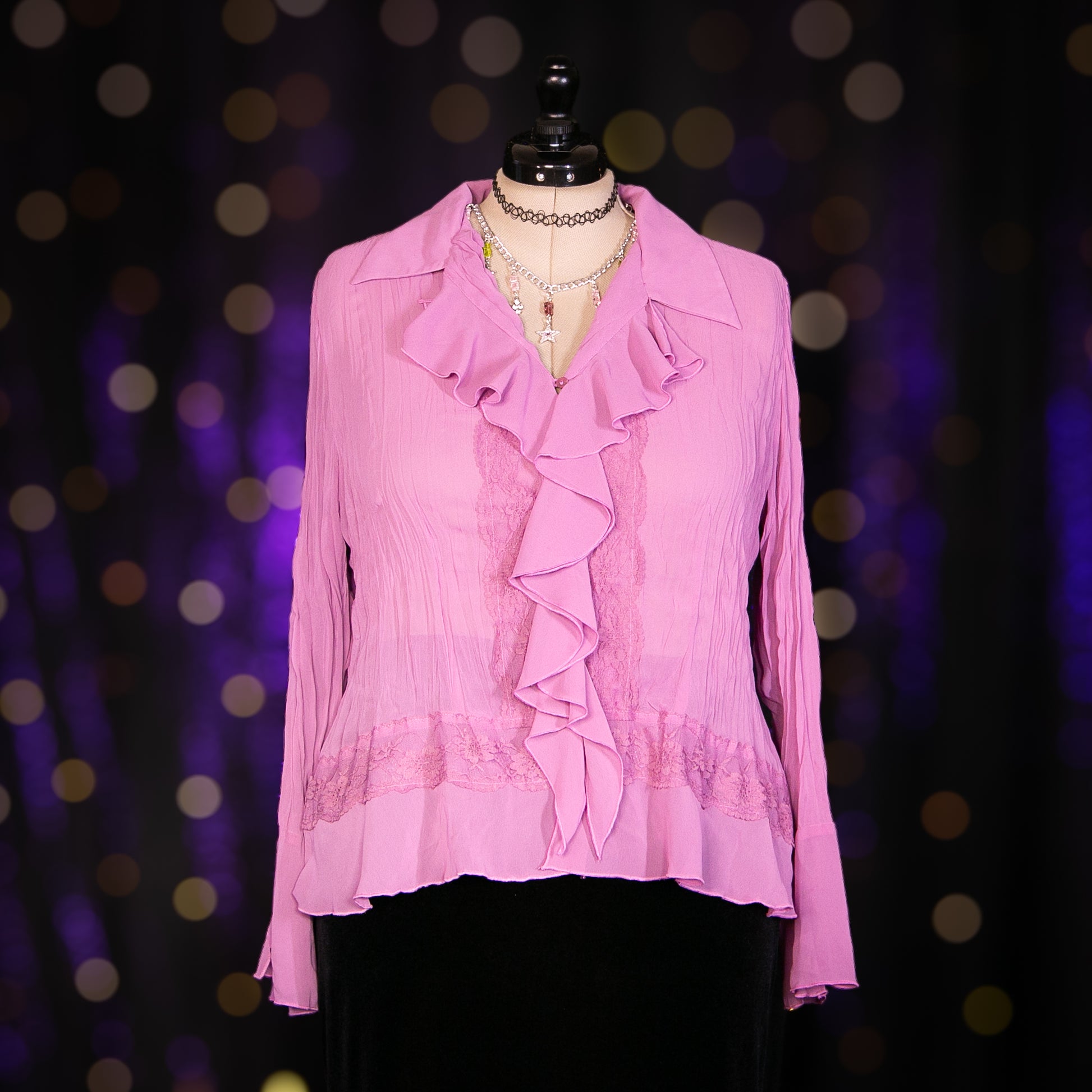 - Features: Wrinkle Pleat Texture; Lace Trim; Ruffled Details; Flared Buttoned Sleeves