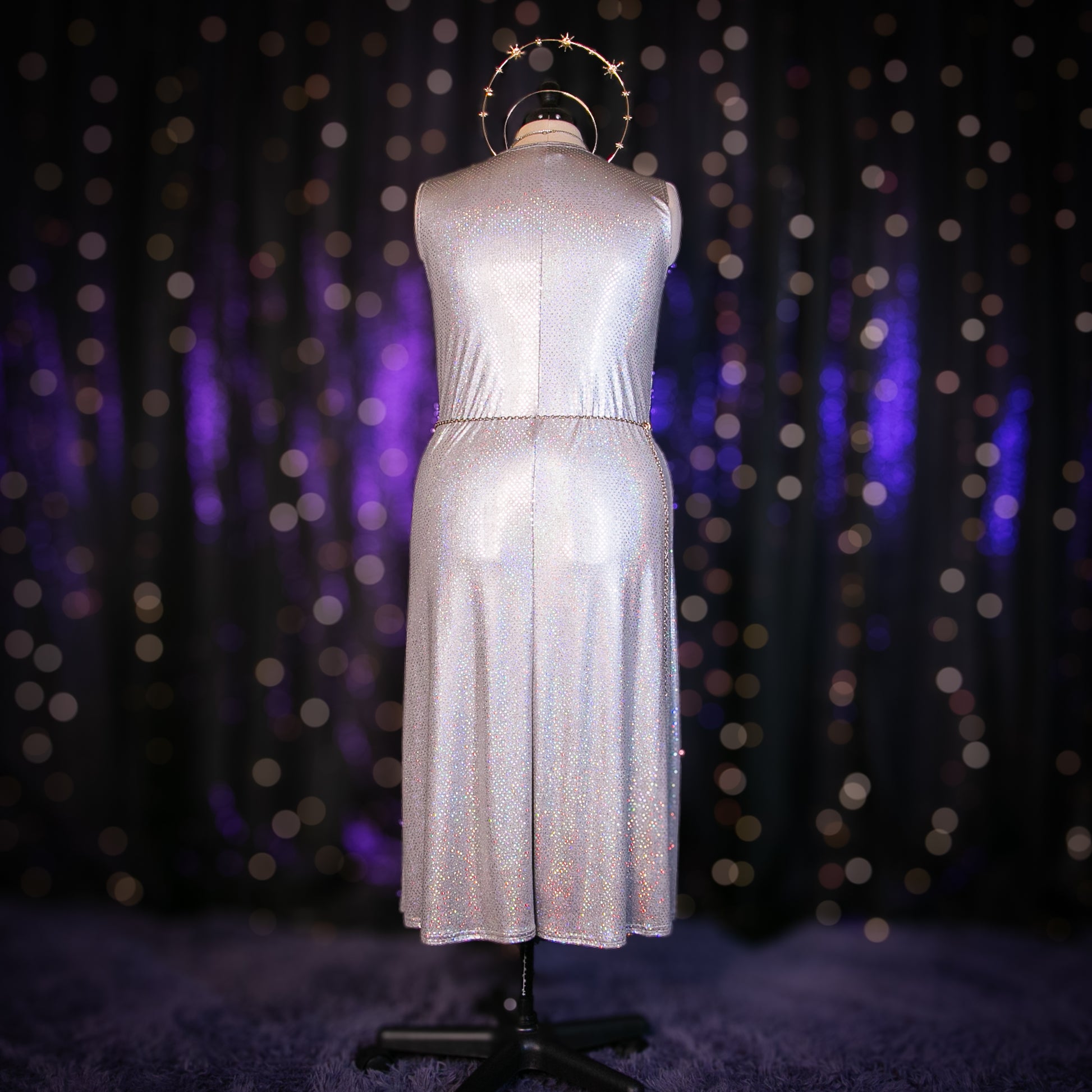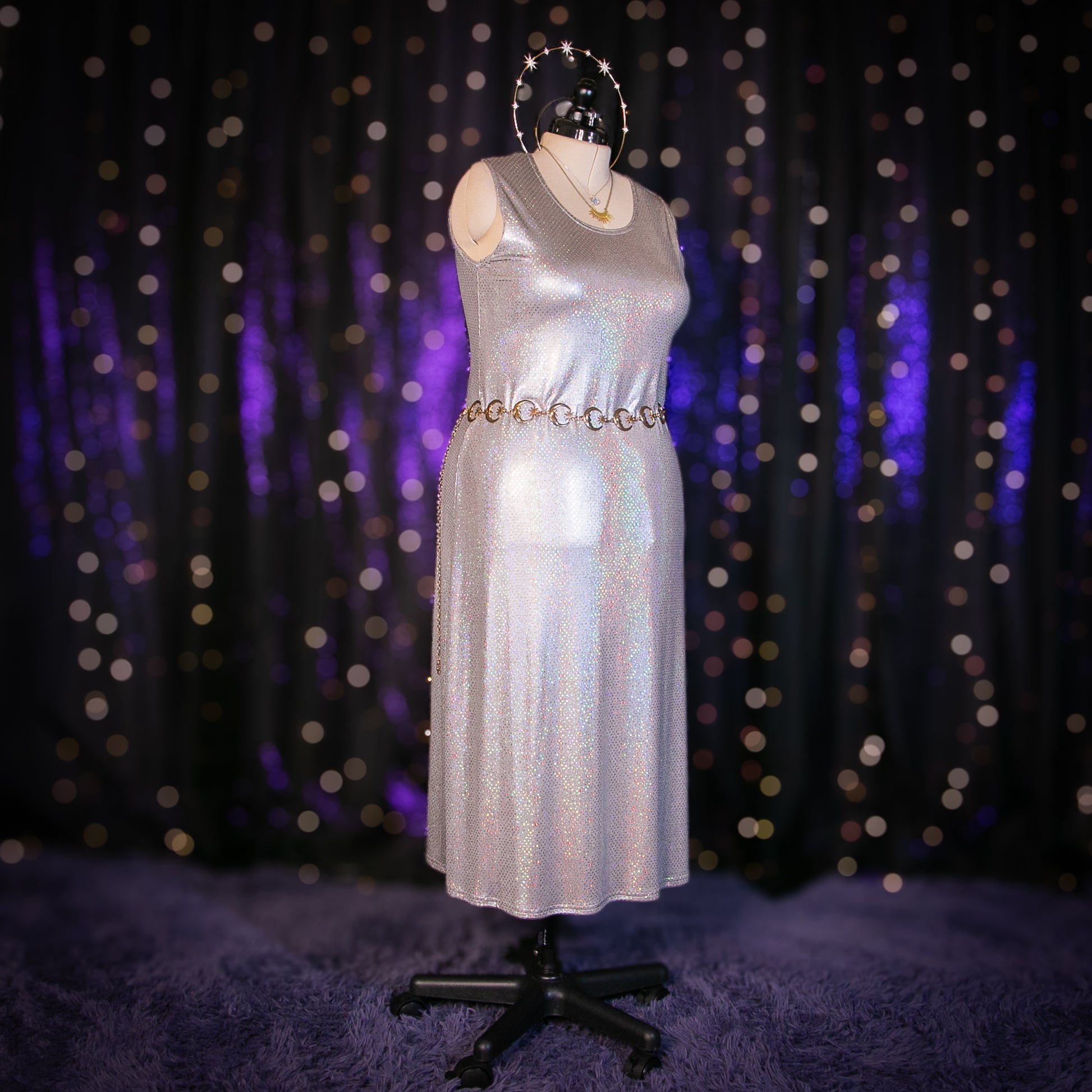 Vintage silver and holographic metallic dress that's perfect for your moon goddess, alien queen, or disco ball costume!
