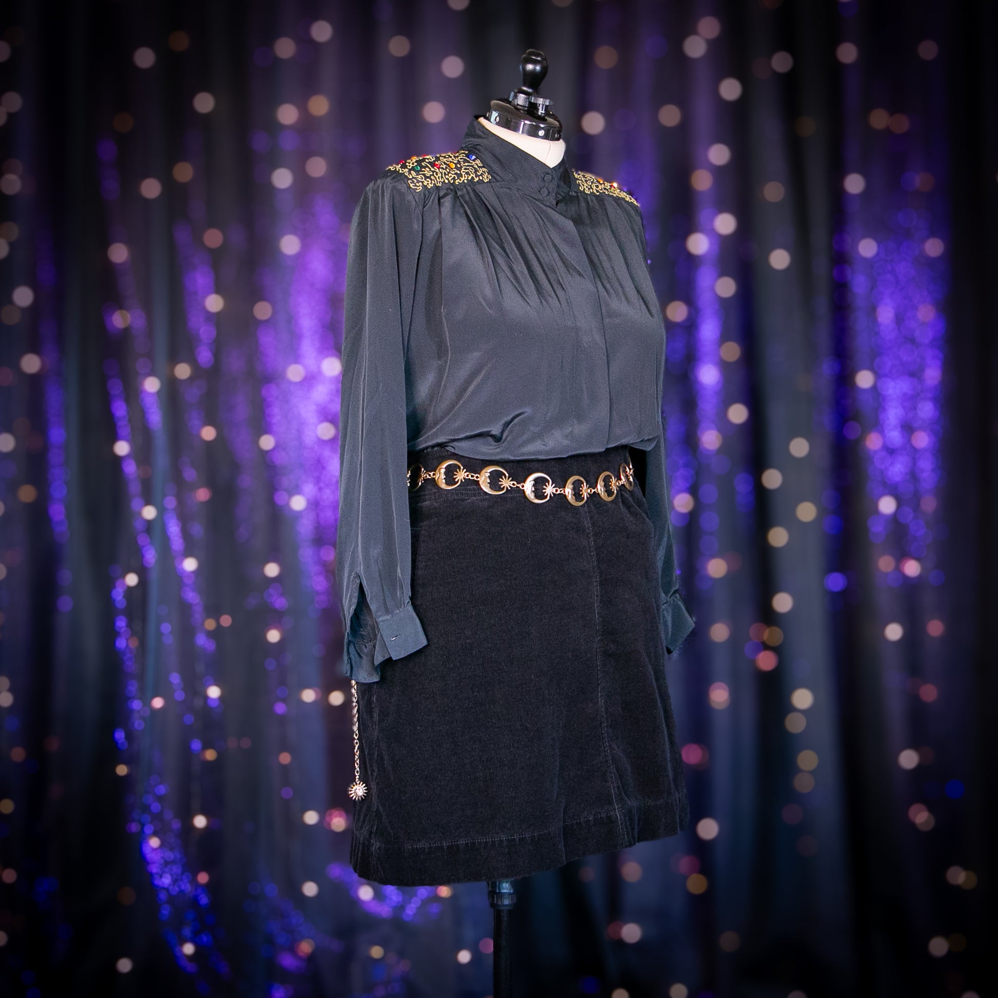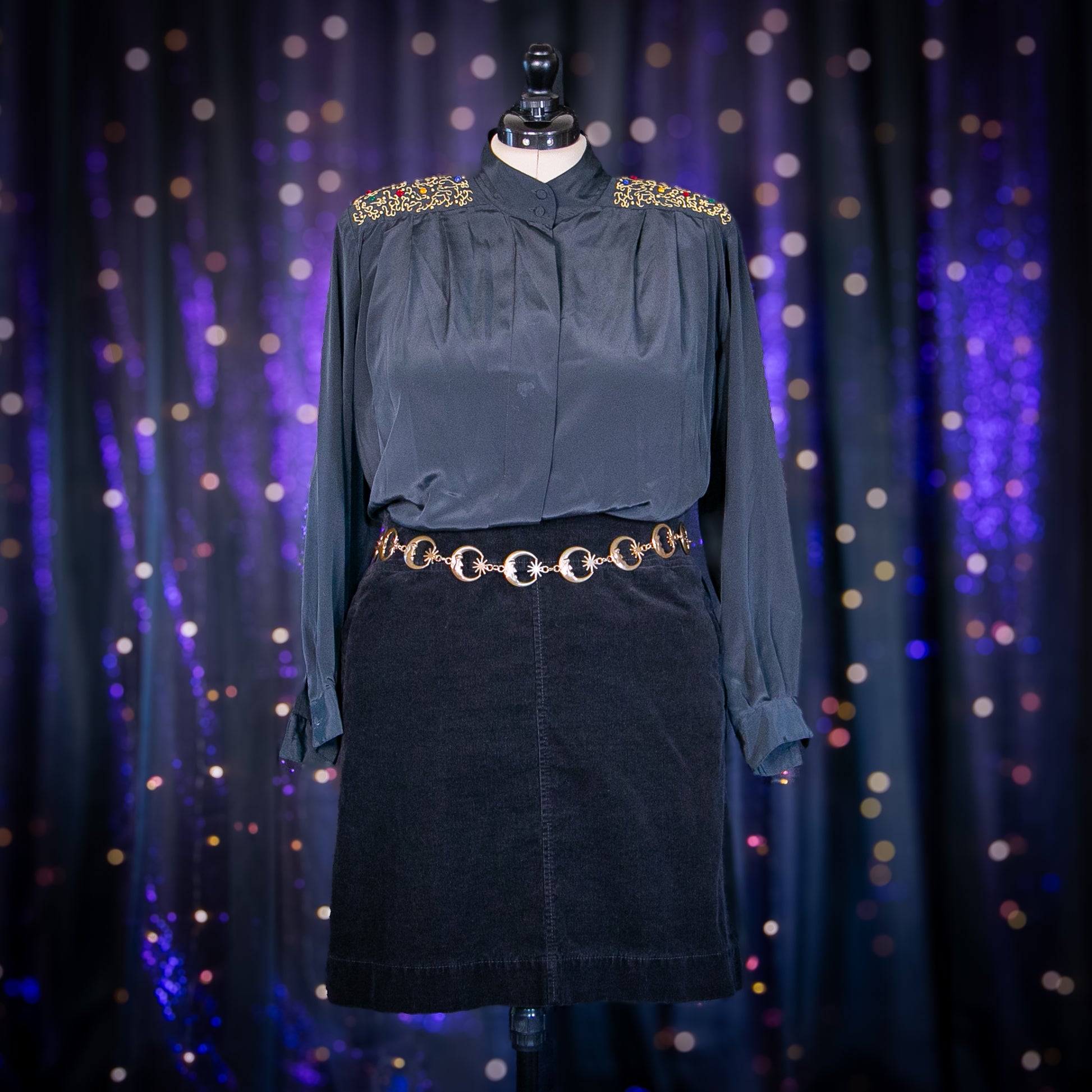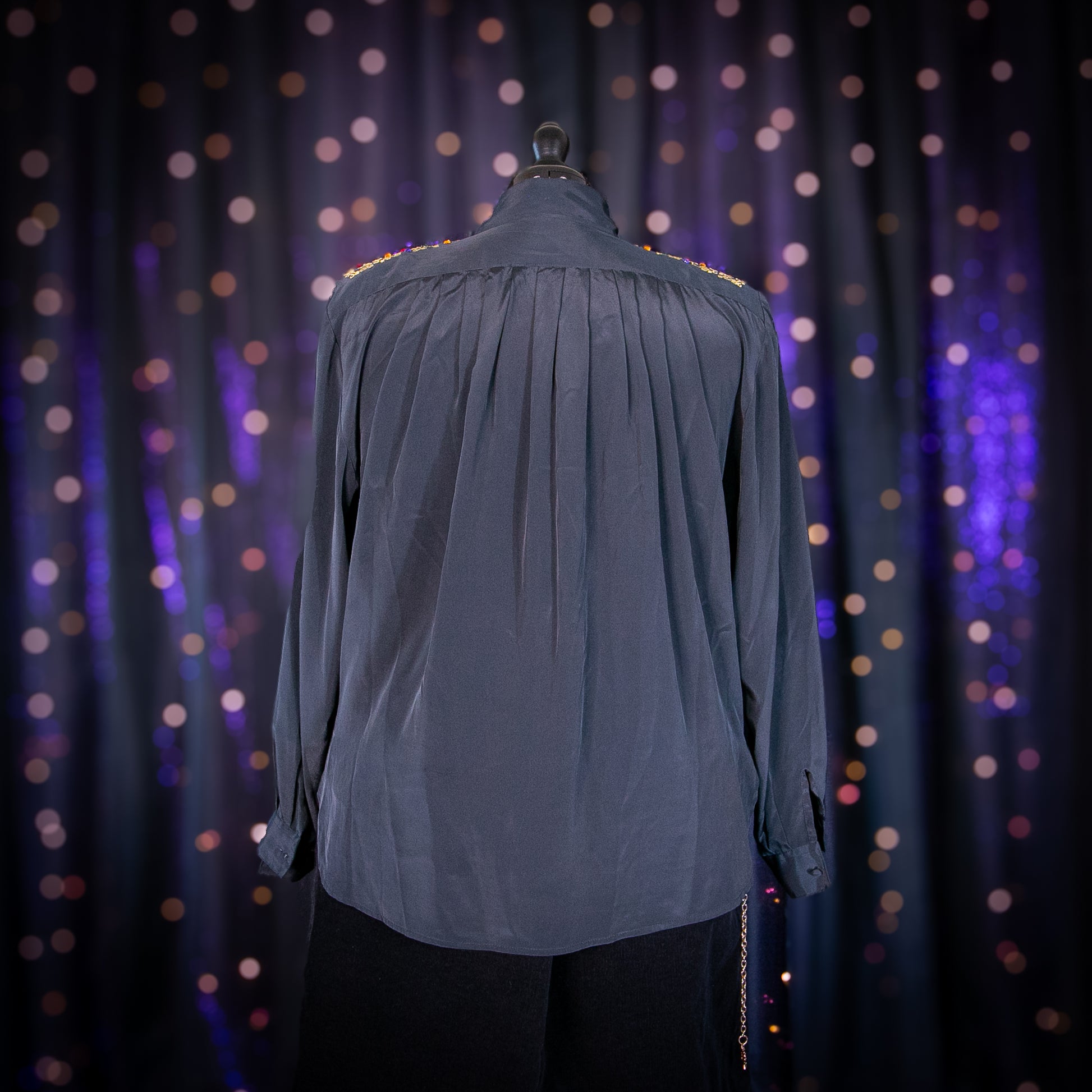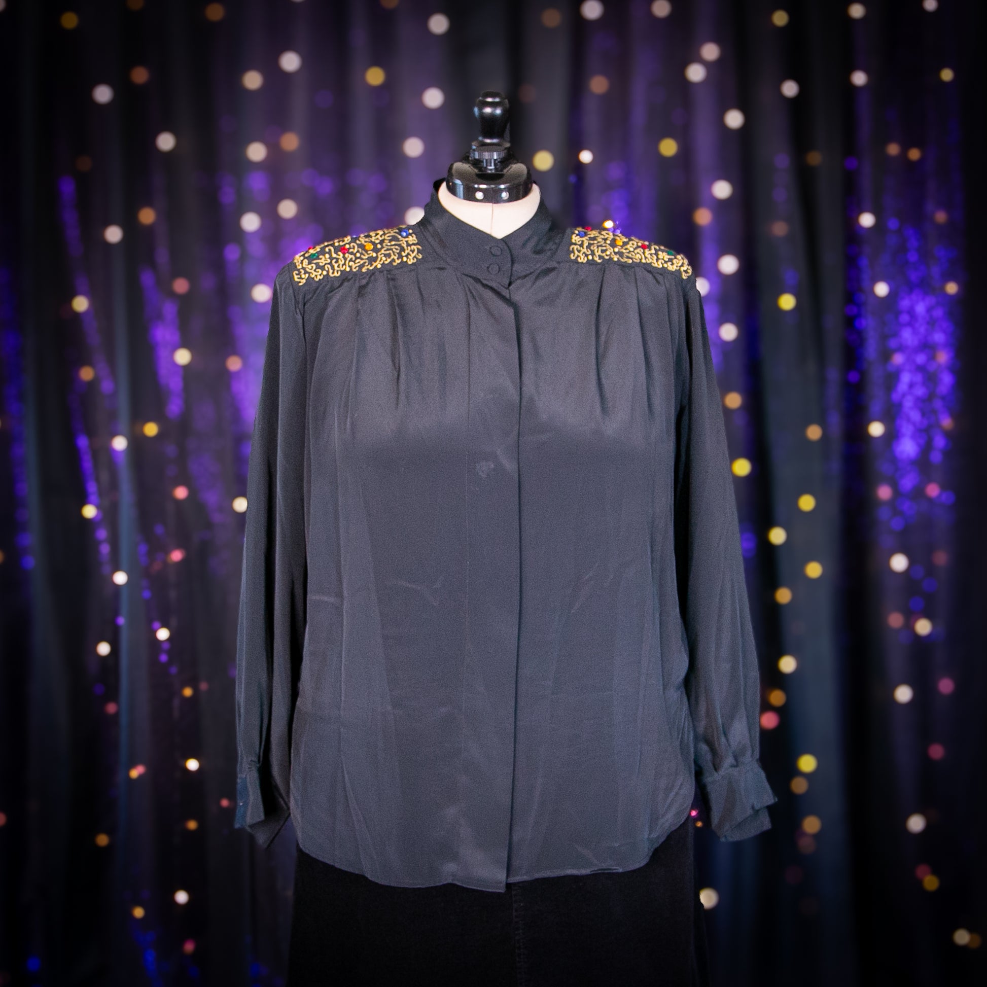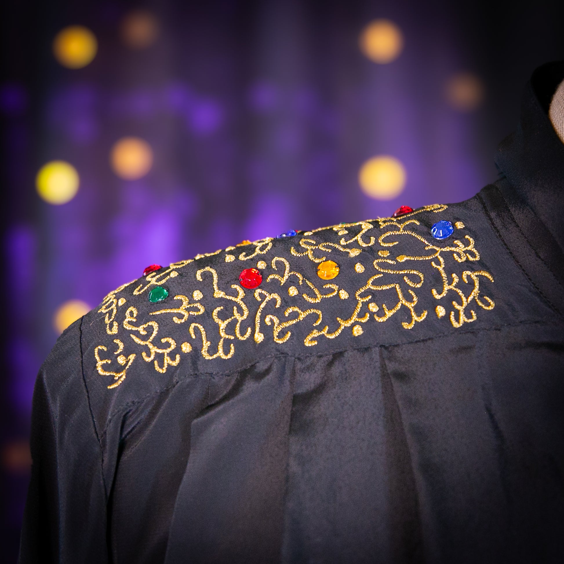 - Pattern: Solid; Gold Embroidery with Red, Blue, Green, Yellow Rhinestones on Shoulders