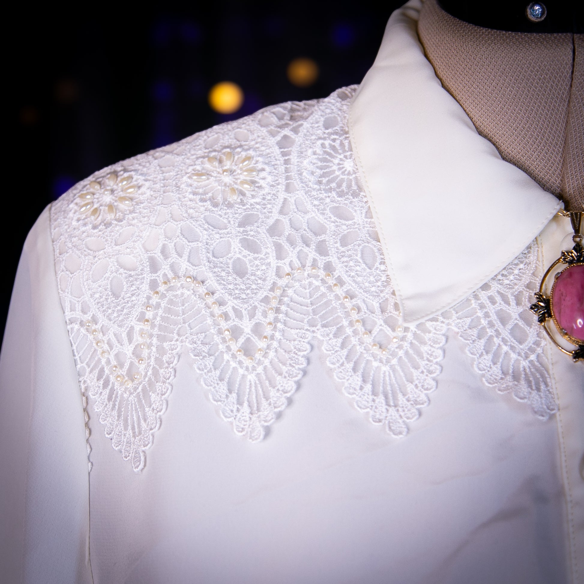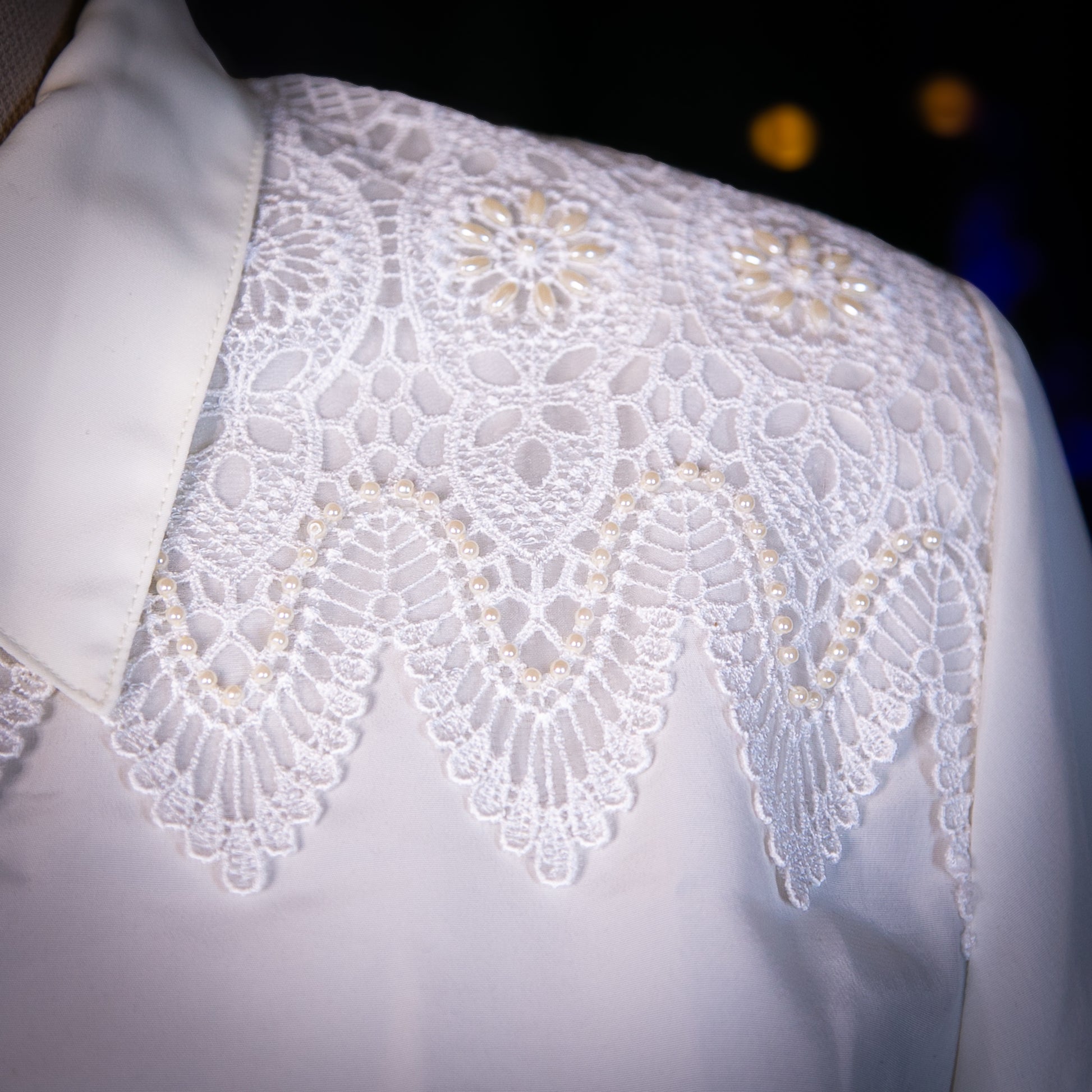 - Features: Beaded Crochet Shoulder Details; Removable Shoulder Padsl Cuffed Sleeves