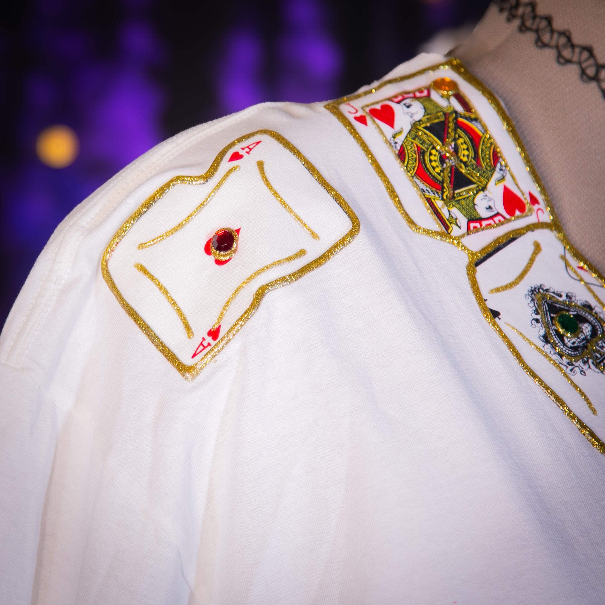 - Other Features: Gold puff glitter with red and green rhinestone details; Removable shoulder pads