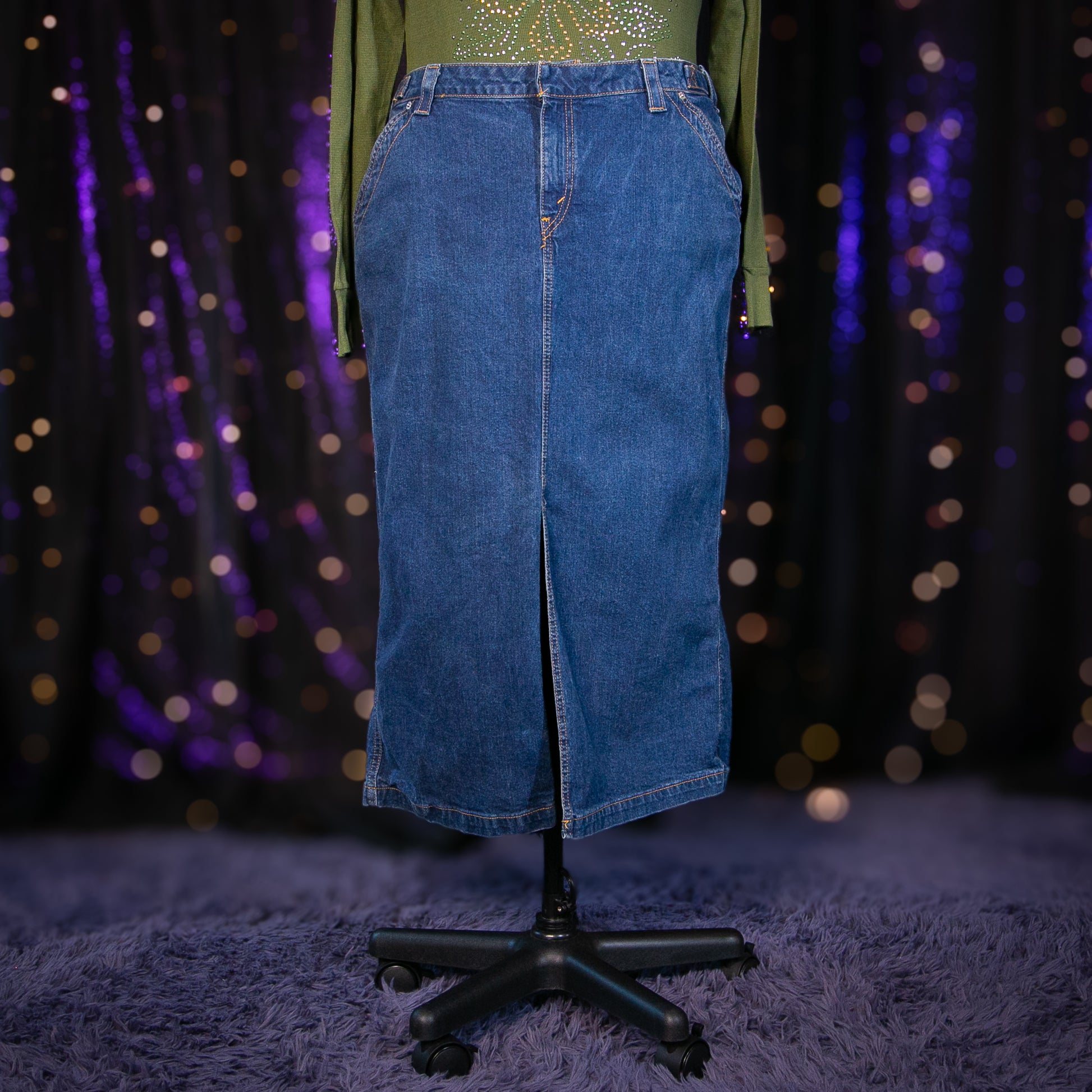 - Features: Silver Adjustable Buckles on Each Side of Waist; Back Skirt Slit; Cotton Denim