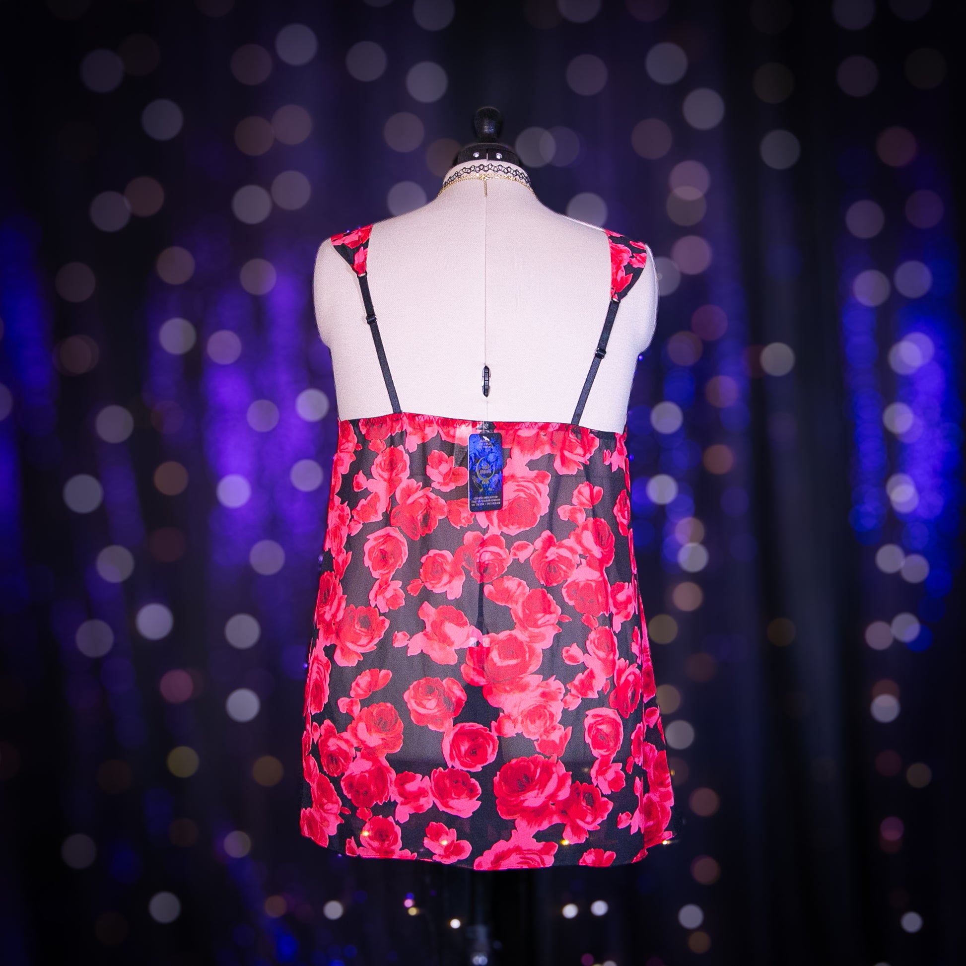 - Features: Elastic at Back; Black and Red Fabric Rosette Details at Bust