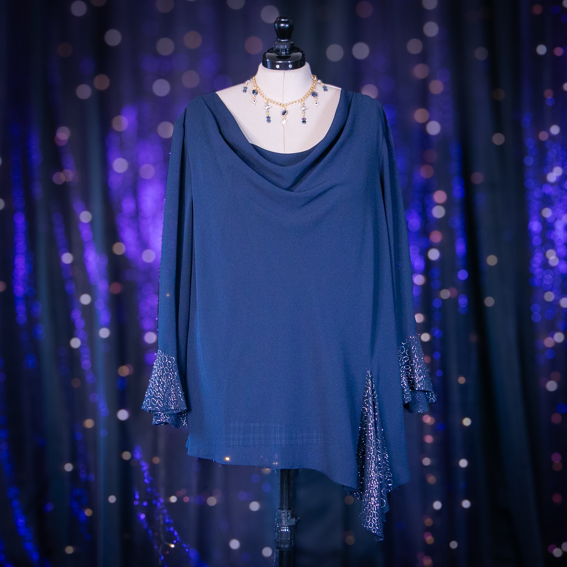 - Features: Semi Sheer Sleeves; Hip Pleat Contrast Detail; Asymmetrical Bottom Hem; Flared Sleeve Cuffs