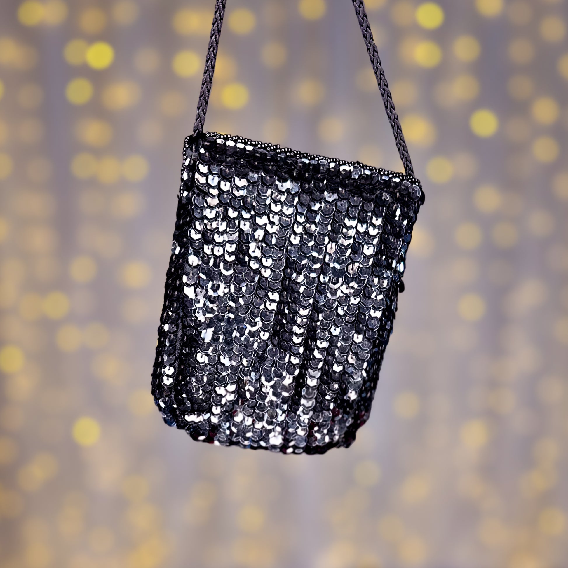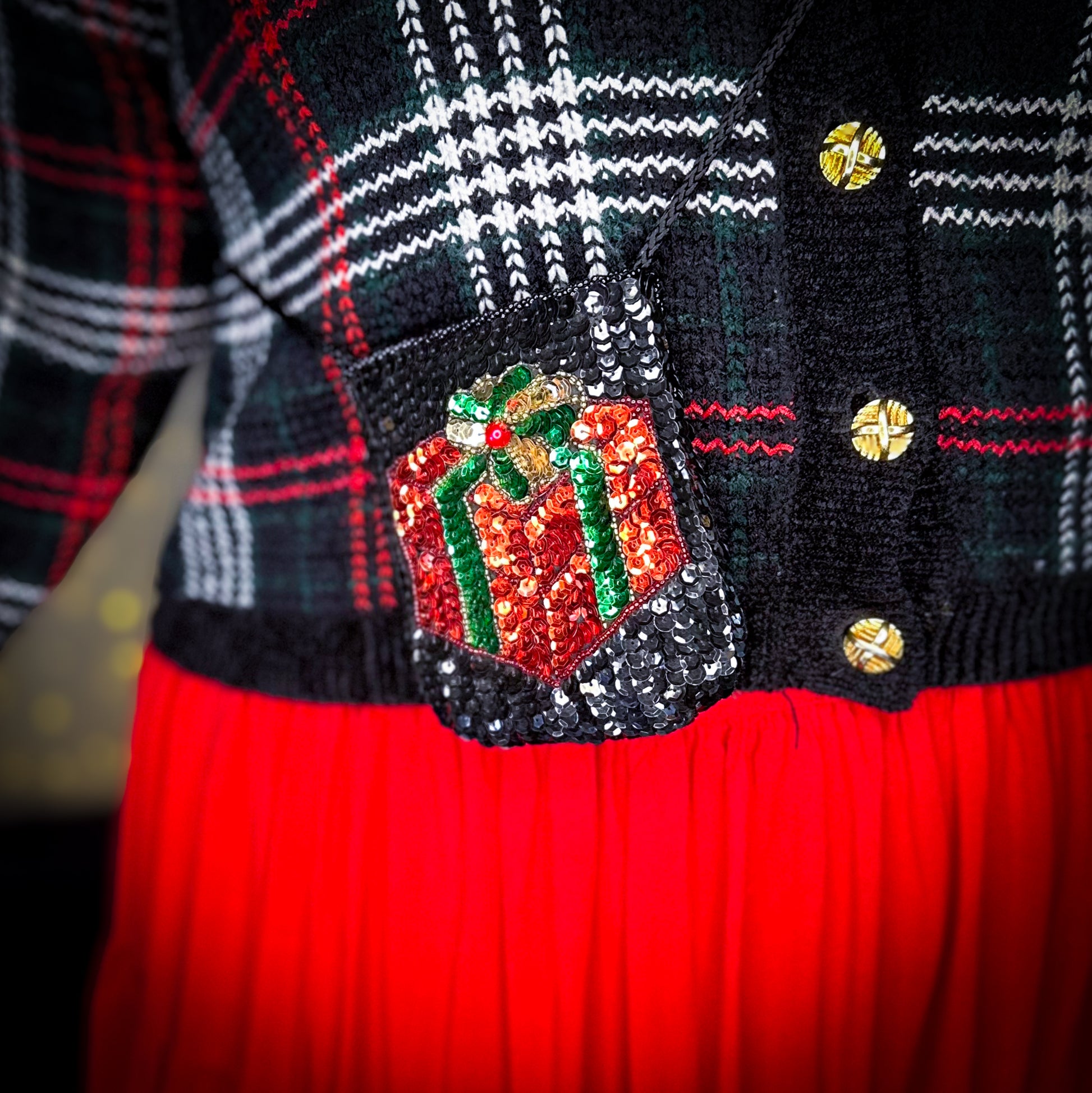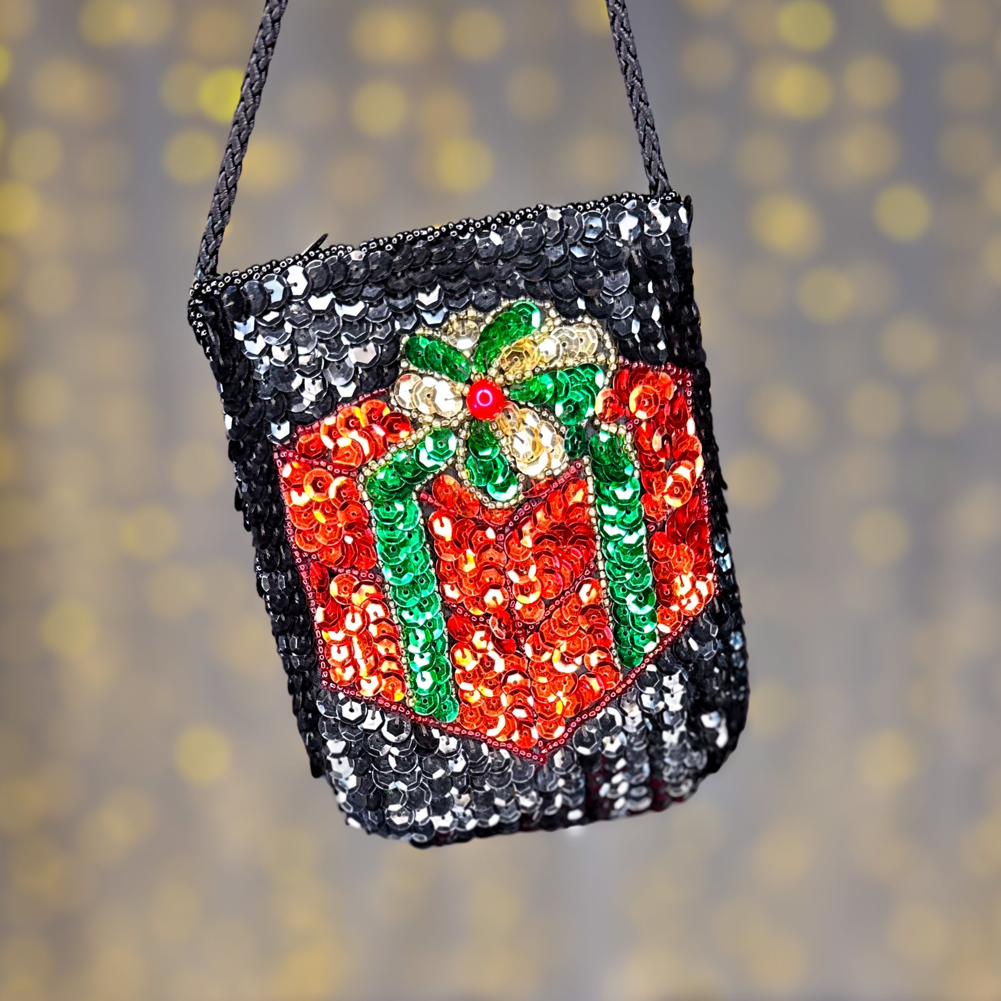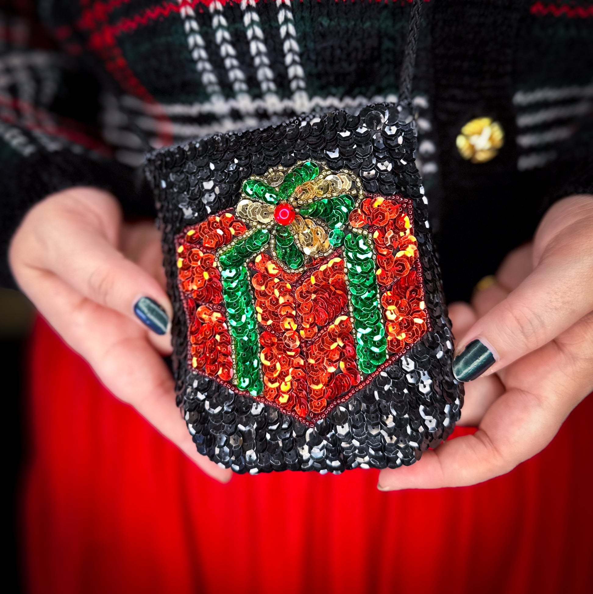 Vintage small wallet-sized black sequin bag with a red, gold and green sequin and beaded gift box. Bag has a long shoulder strap and a zipper closure.