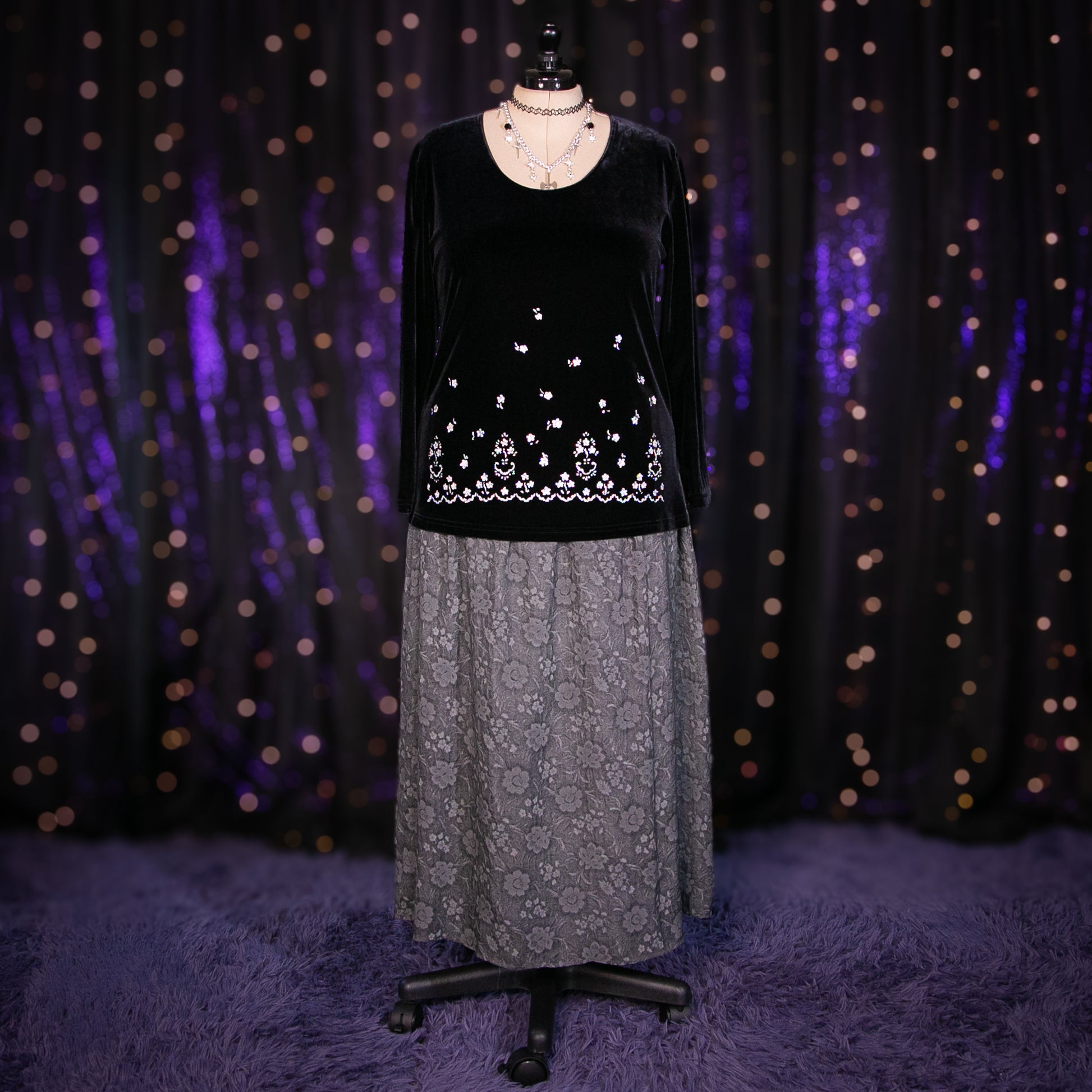 - Pattern: Solid with Silver Glitter Cascading Florals at Bottom Hem
