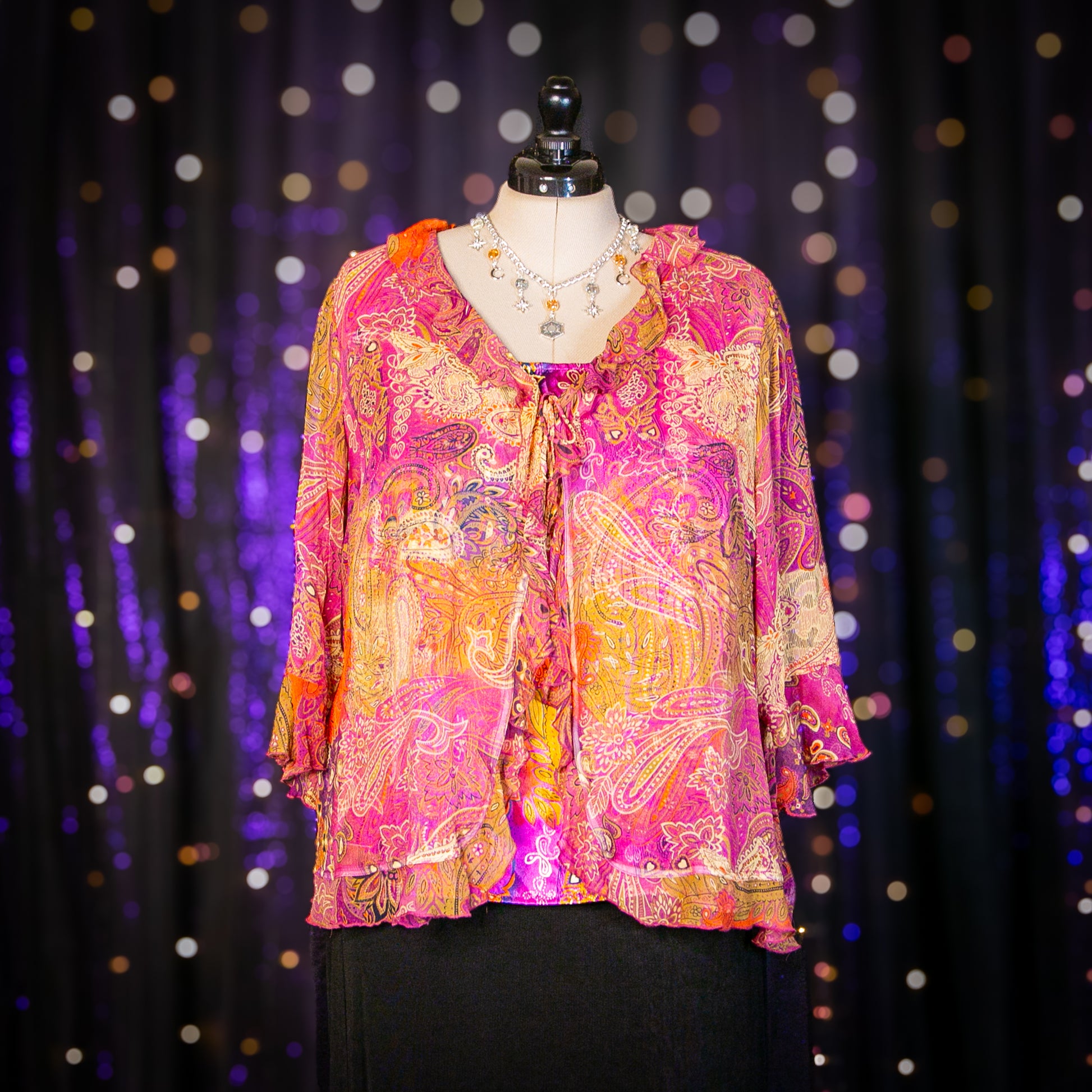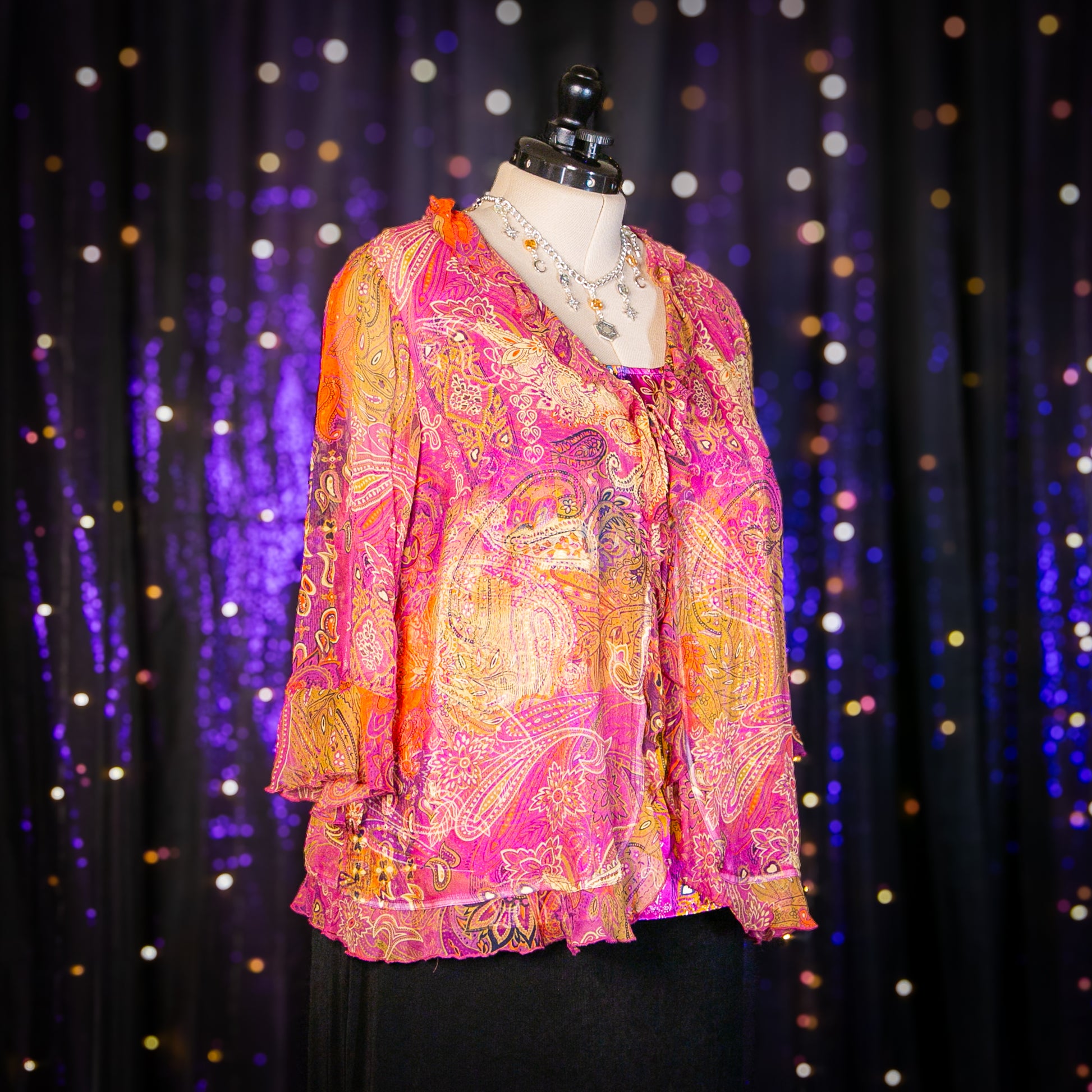 - Features: 100% Silk; Ruffled Neckline; Flared Sleeve Cuffs