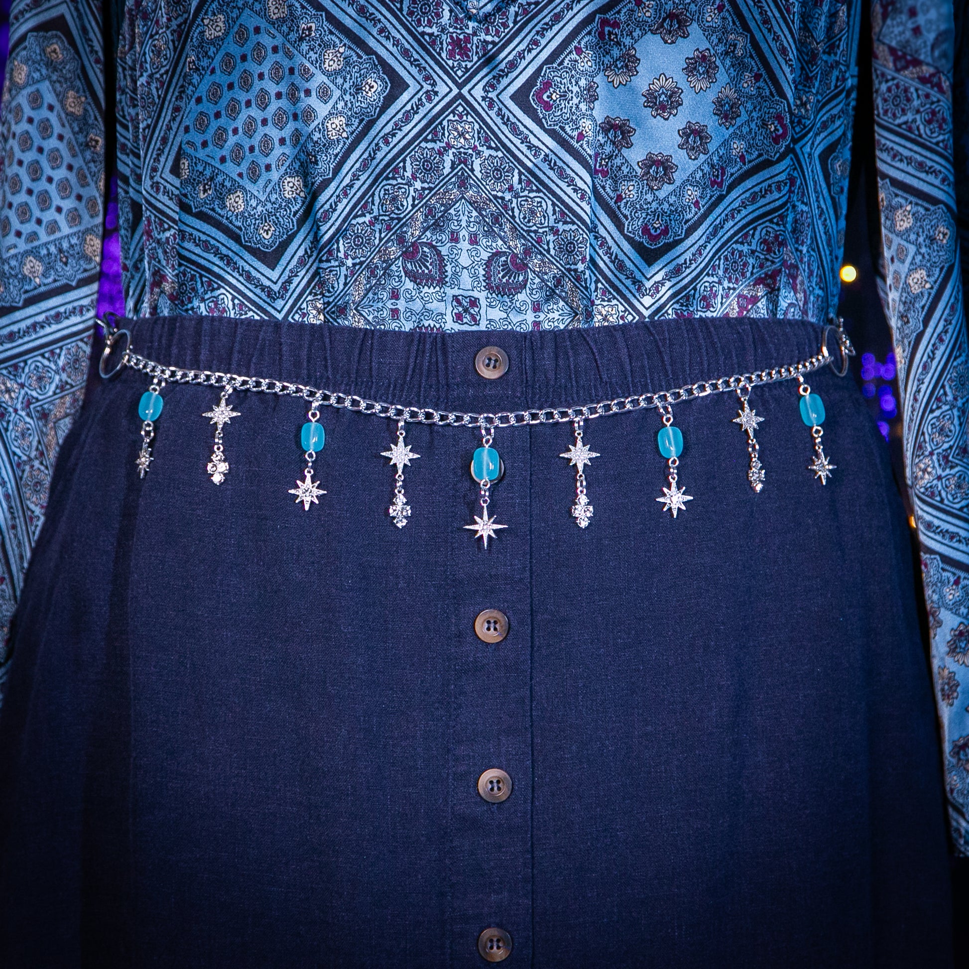 Silvertone Charmed Chain with icy blue glass beads and a variety of starburst celestial rhinestone charms.