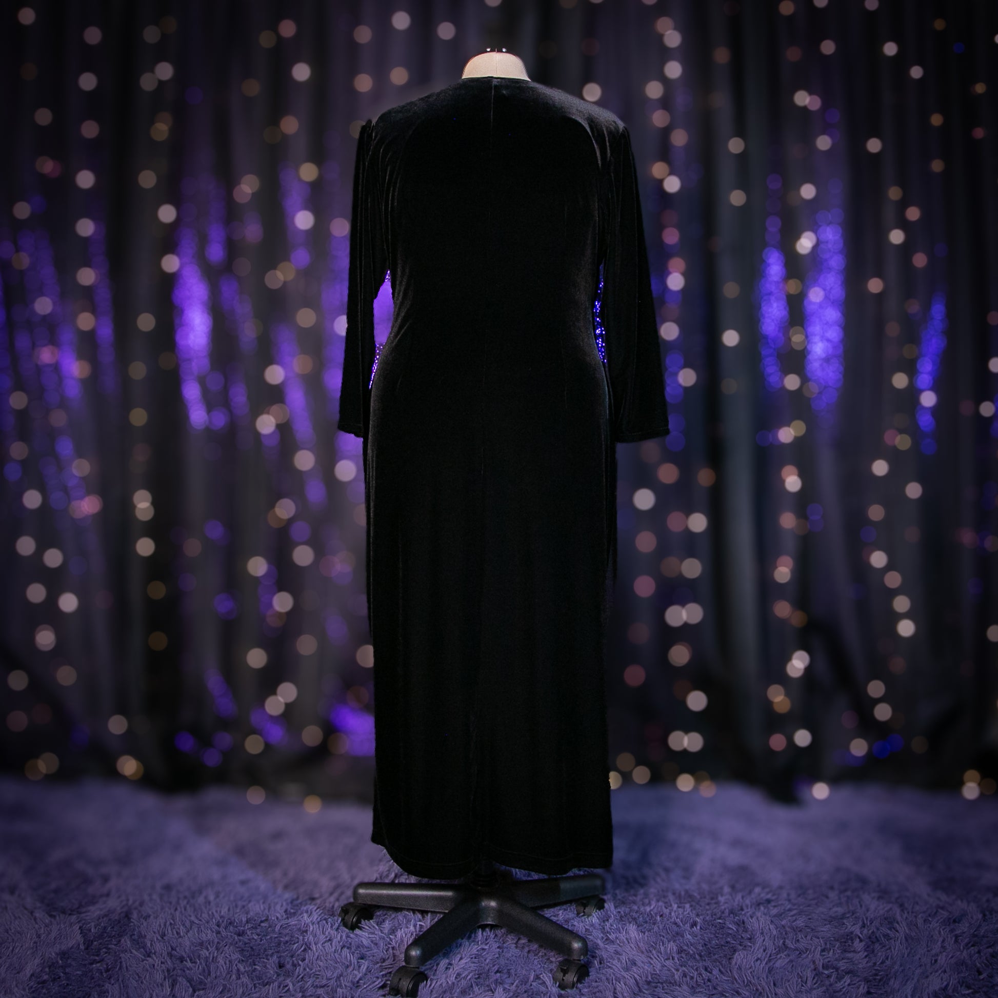 Vintage black stretch velvet maxi dress with a super deep v and side ruching, fit for the Mistress of the Dark.