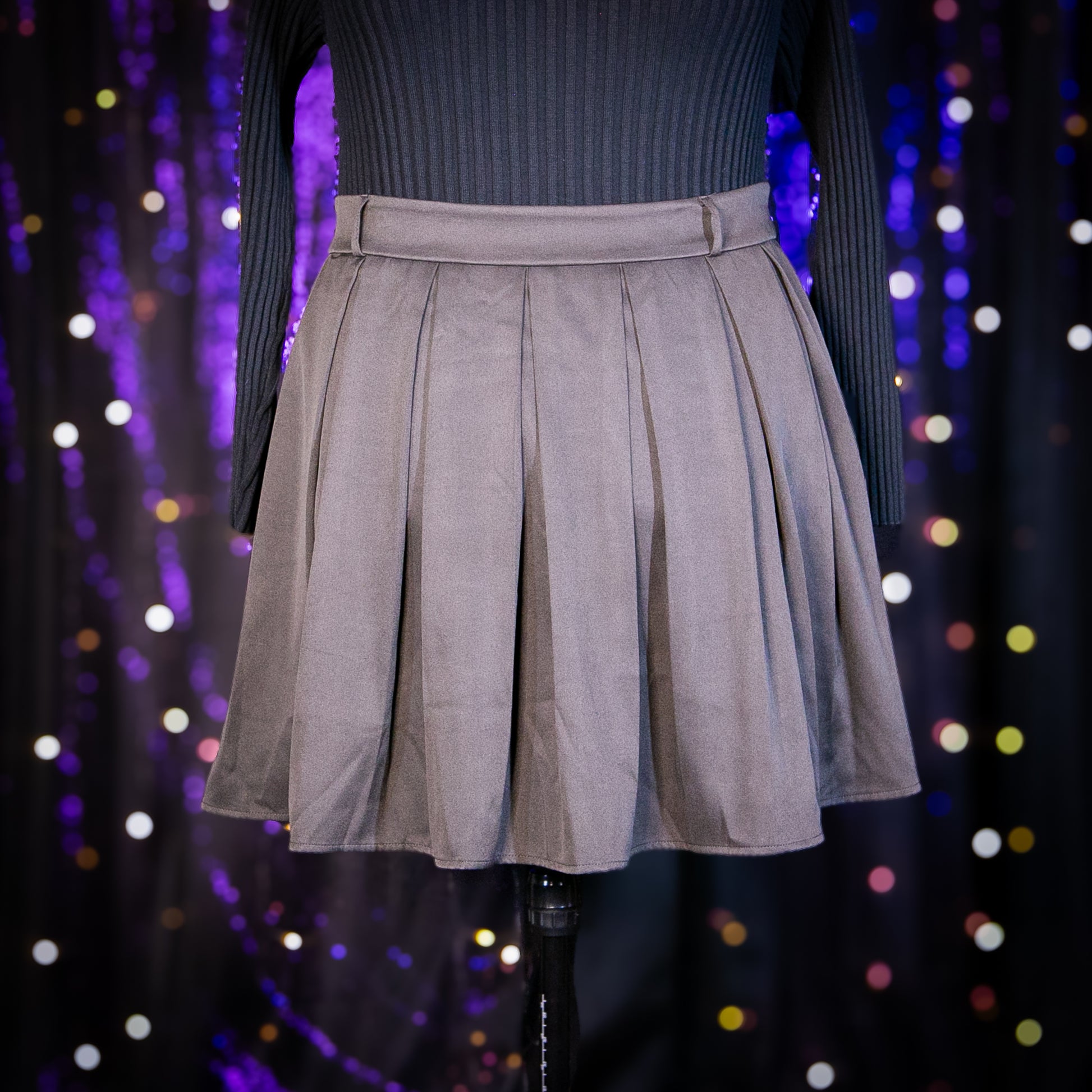 Modern dark gray pleated mini skirt that would be perfect for a Heathers or dark academia-inspired costume.