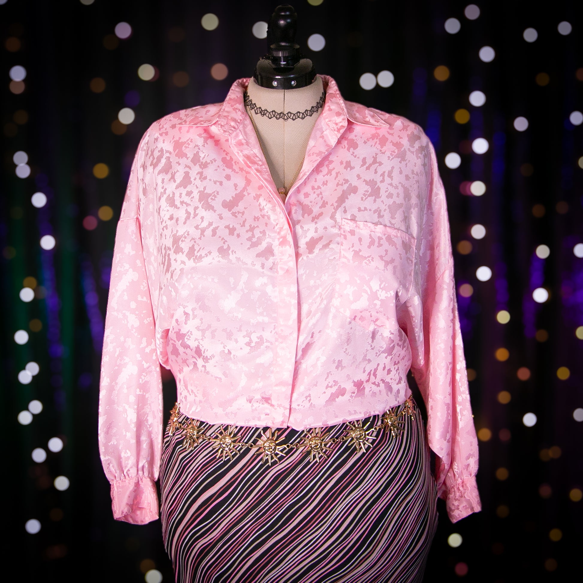Vintage Y2K black knee/midi length slip skirt with a rose and pale pink, white and tan wavy striped print. Skirt is lined and has a diagonal bottom hem. Slight bias cut. Elastic waistline.