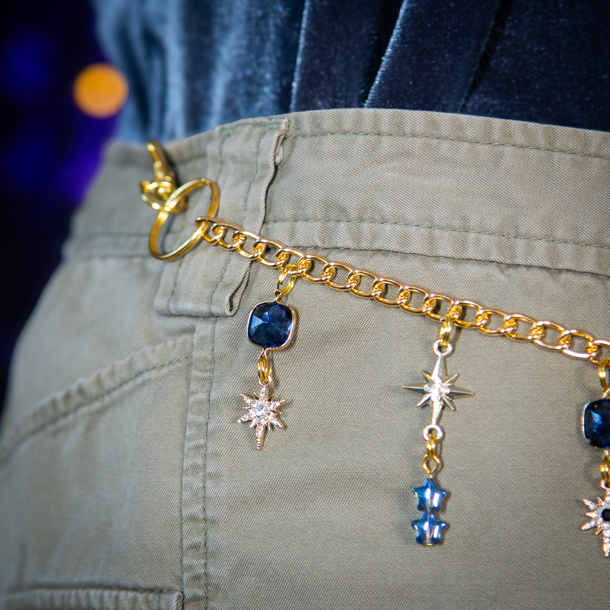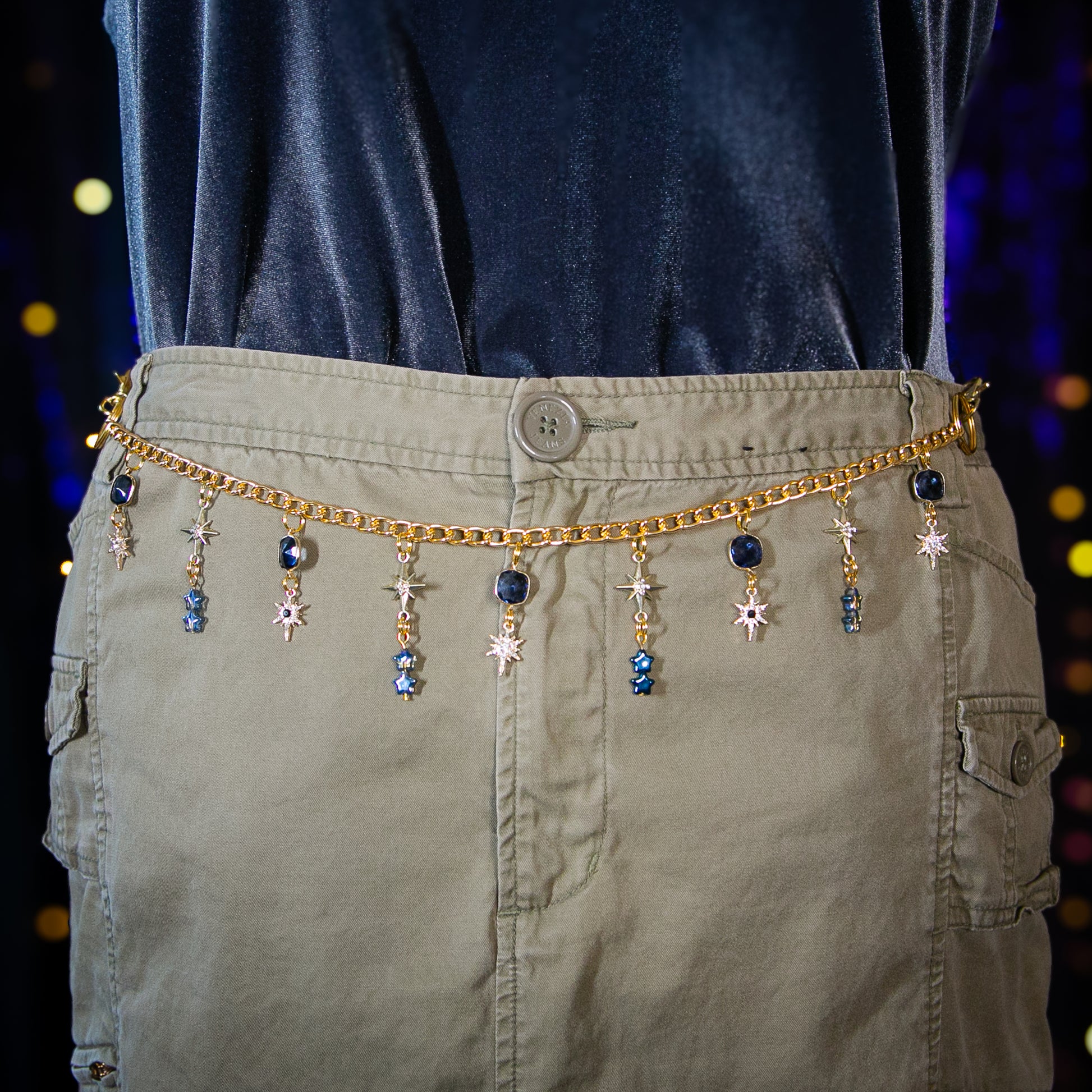 Gold tone Charmed Chain with an assortment of faceted blue beads with a variety of starburst celestial rhinestone charms and star beads.