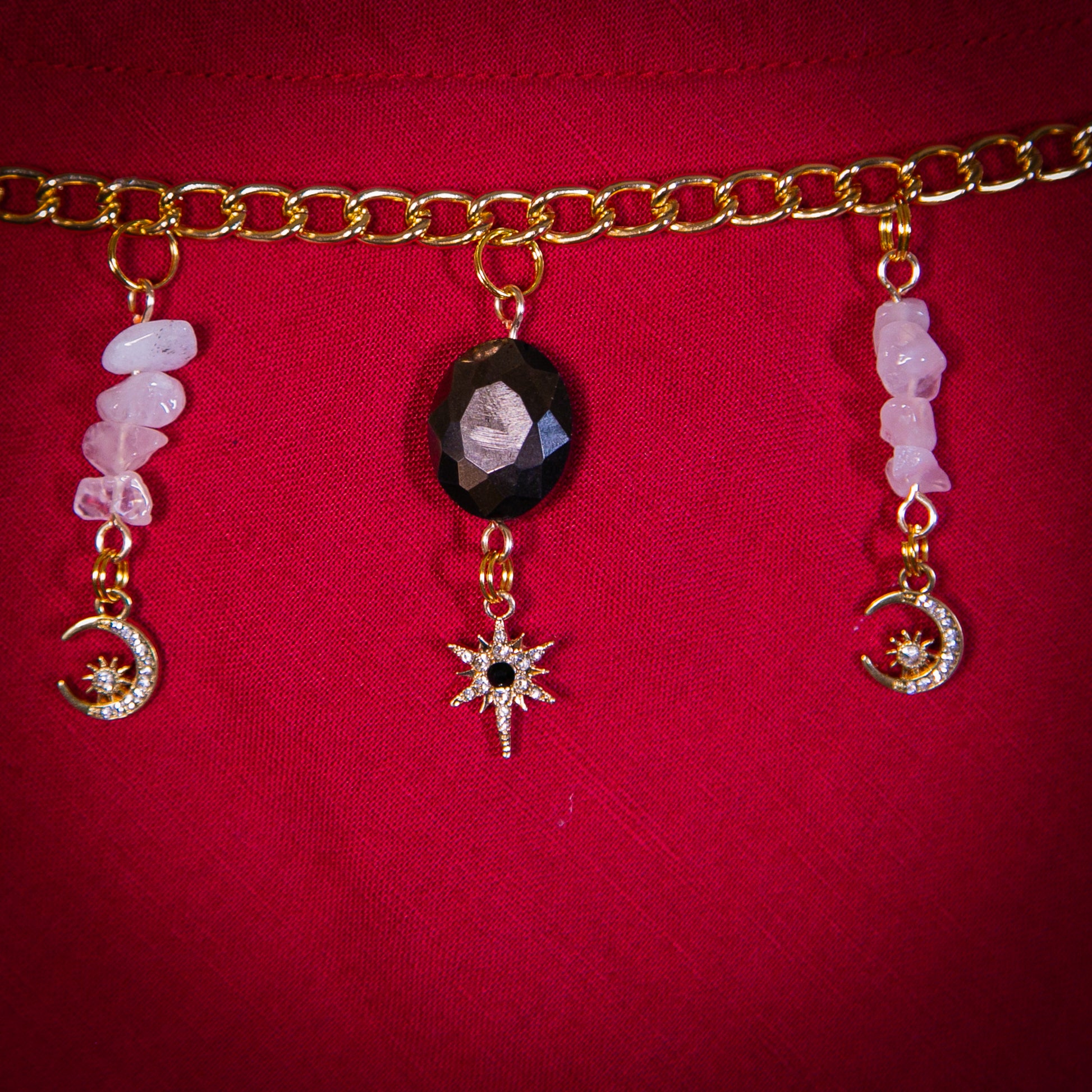 Goldtone Charmed Chain with an assortment of black faceted beads, clear quartz crystal chips, and a variety of starburst celestial rhinestone charms.