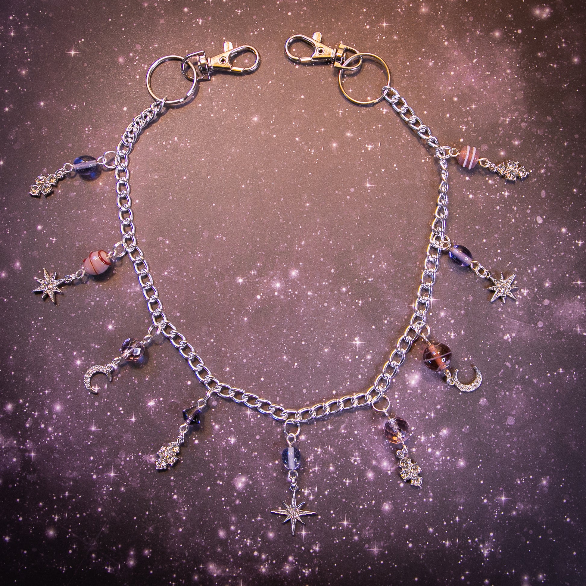 Silver tone Charmed Chain with an assortment of lavender purple and mauve beads, rhinestone charms, crescent moons and starbursts.