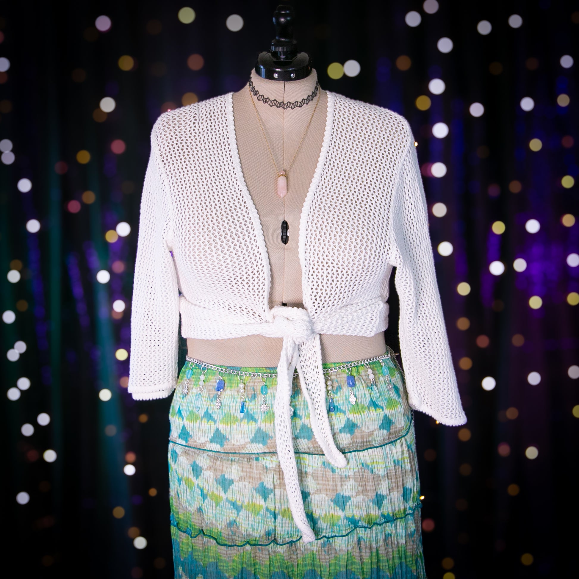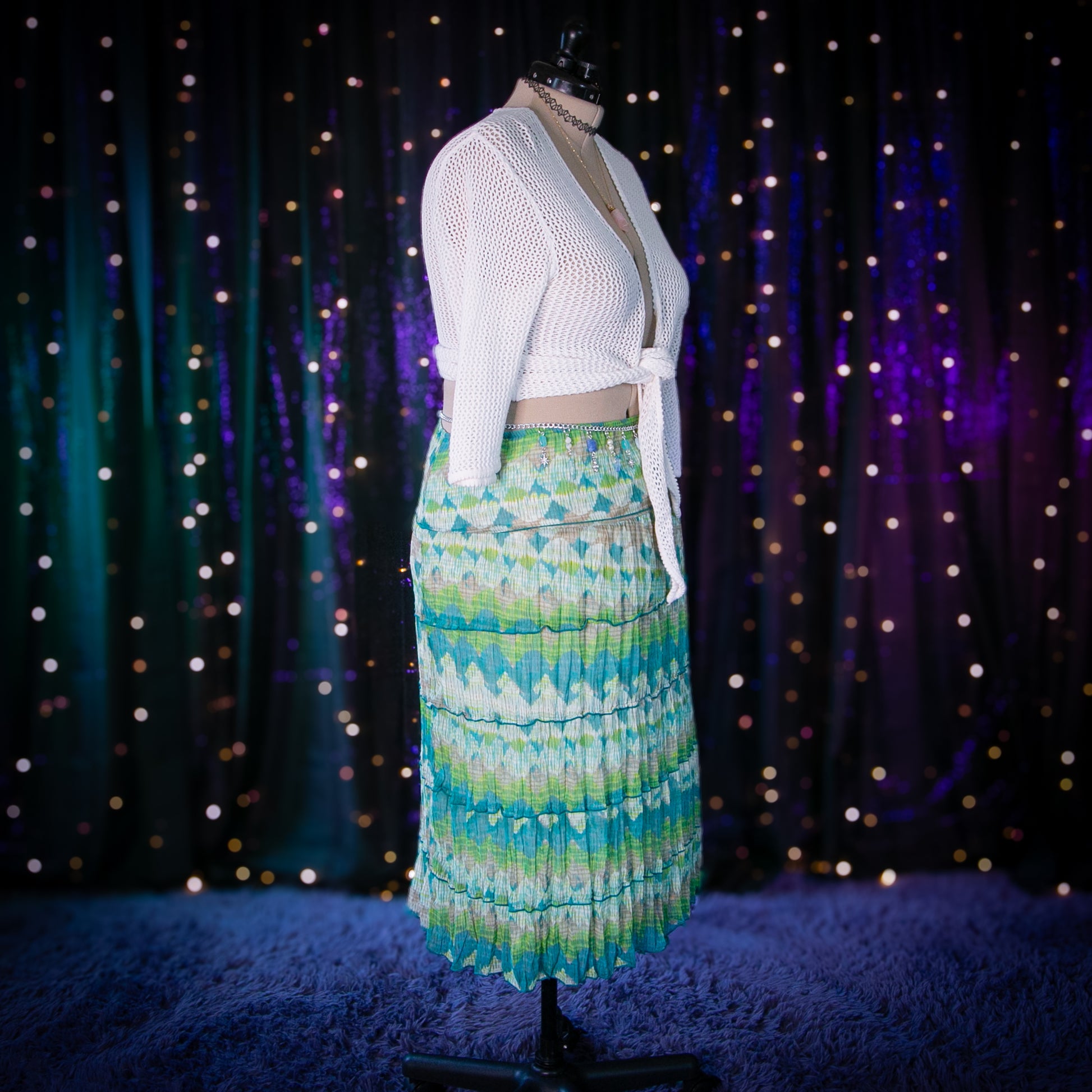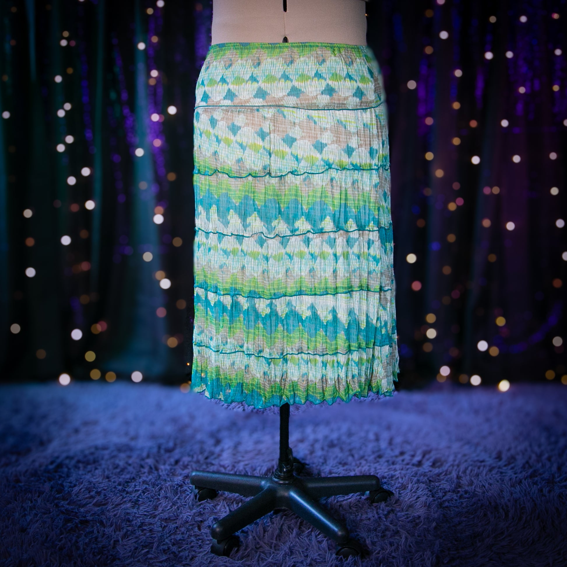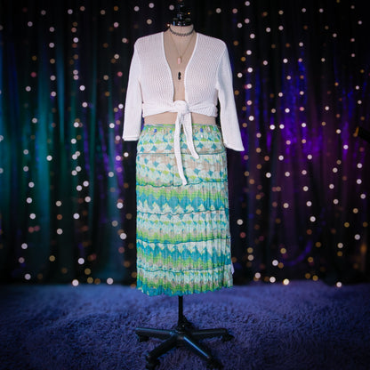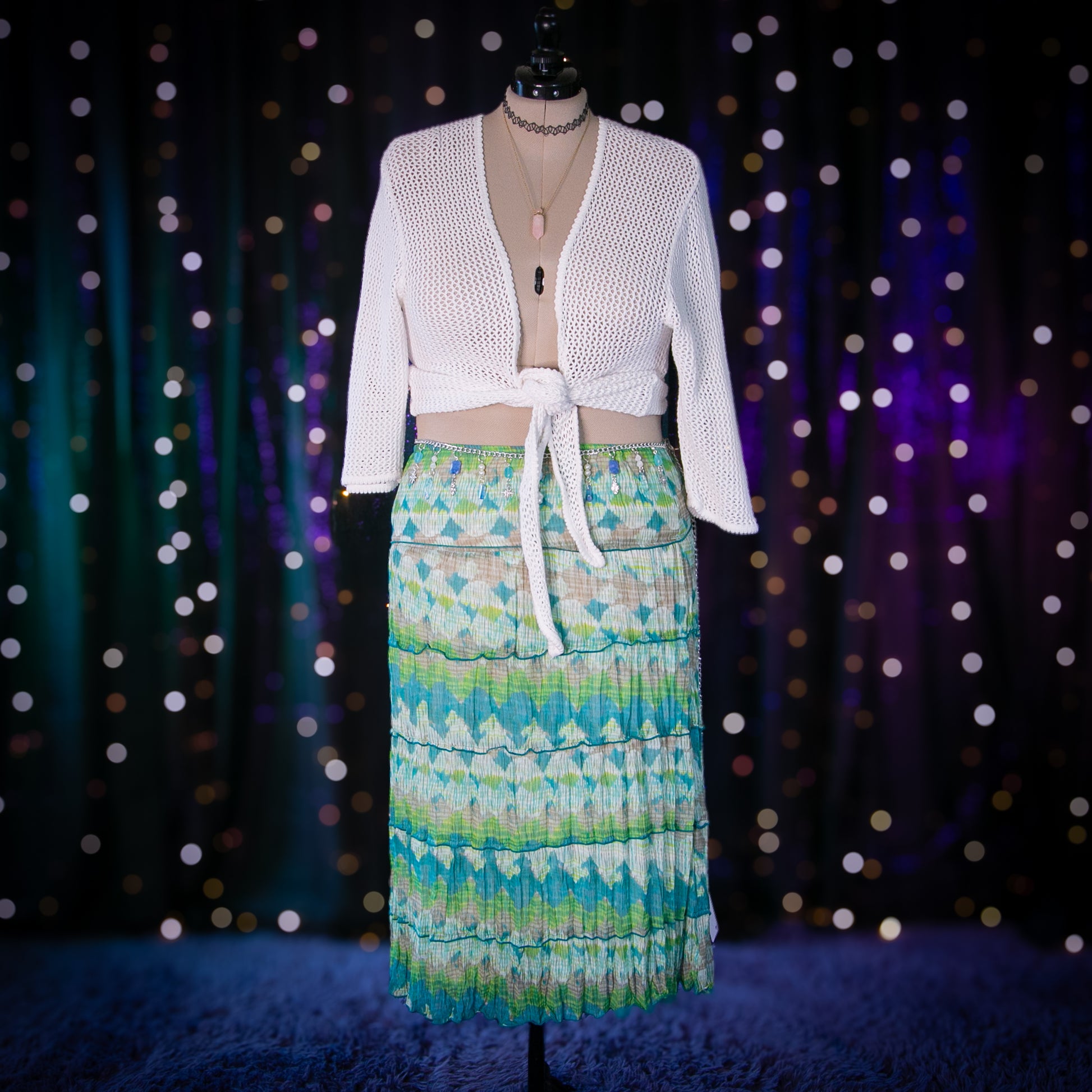 Vintage 90s/Y2K white midi length tiered skirt with a bright lime green, ocean blue and tan watercolor ikat print. Skirt is lined and has a thin elastic waistline.