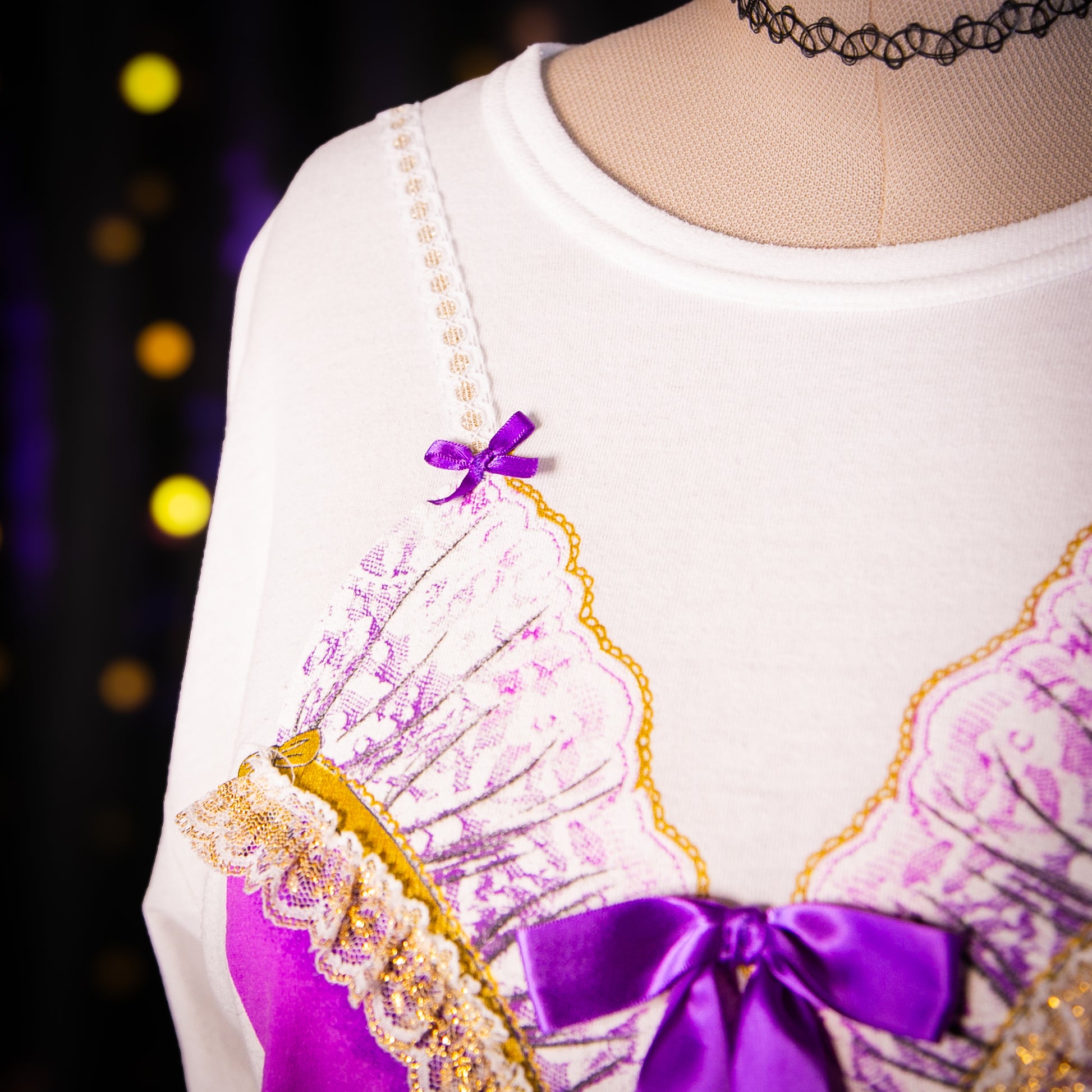 - Pattern: Purple bustier print on front and back