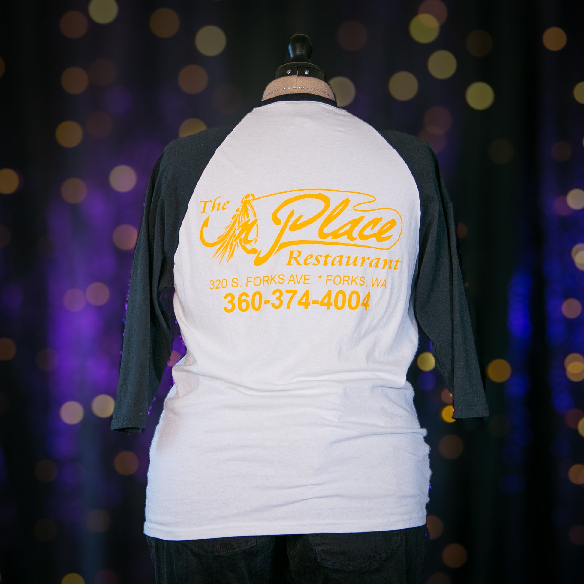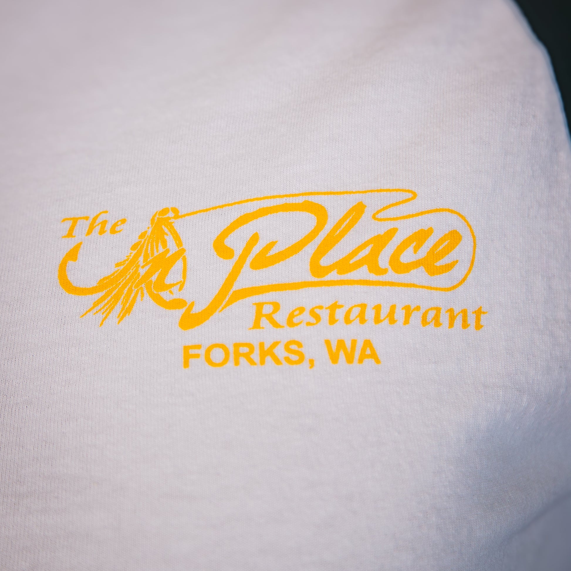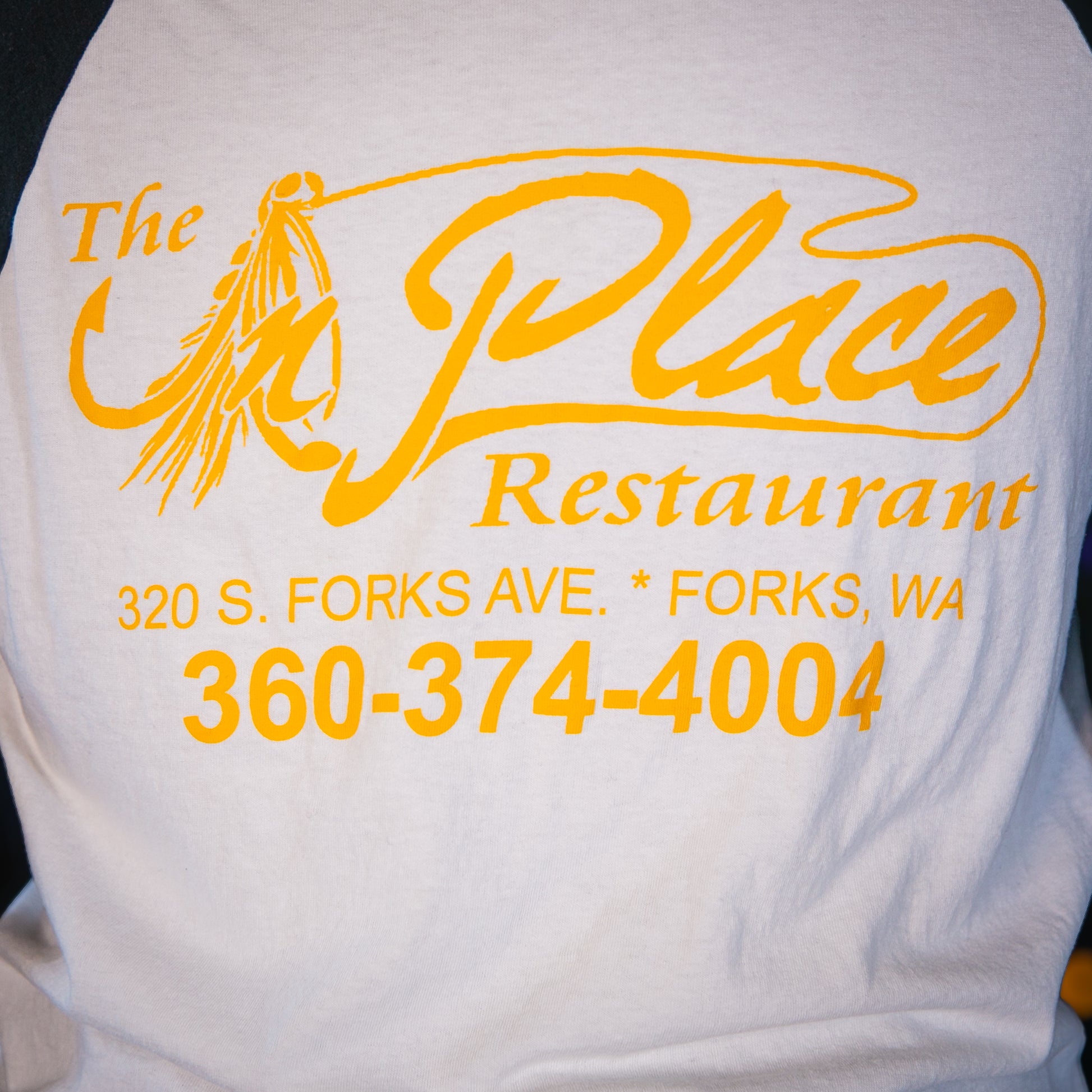 - Pattern: Solid White Body and Black Sleeves and Trim, with Yellow "The In Place Restaurant at Forks, Washington) Screenprint