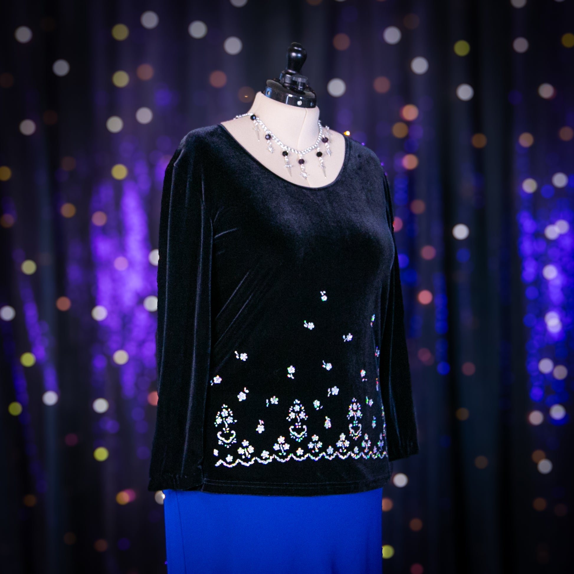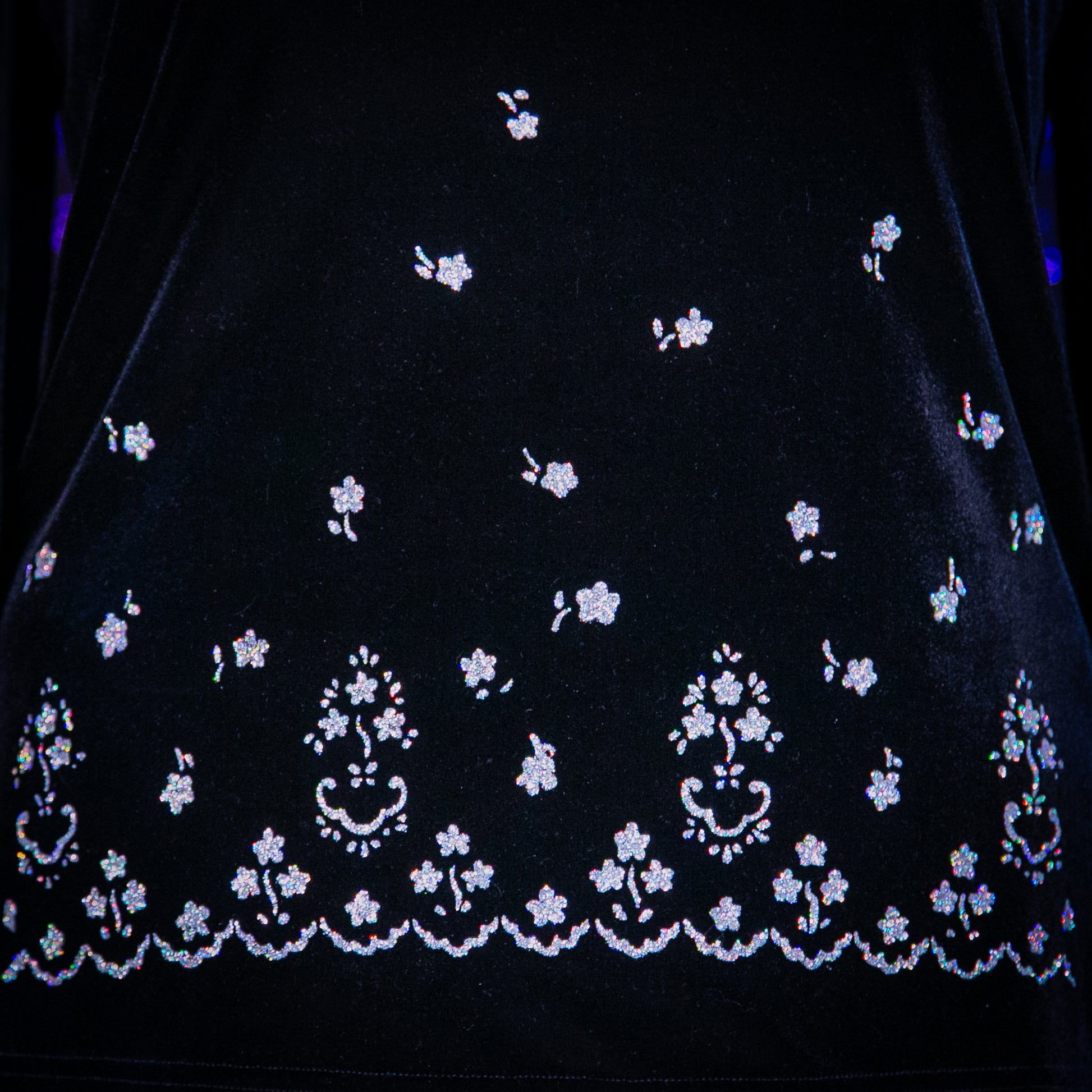- Pattern: Solid with Silver Cascading Florals at Bottom Hem